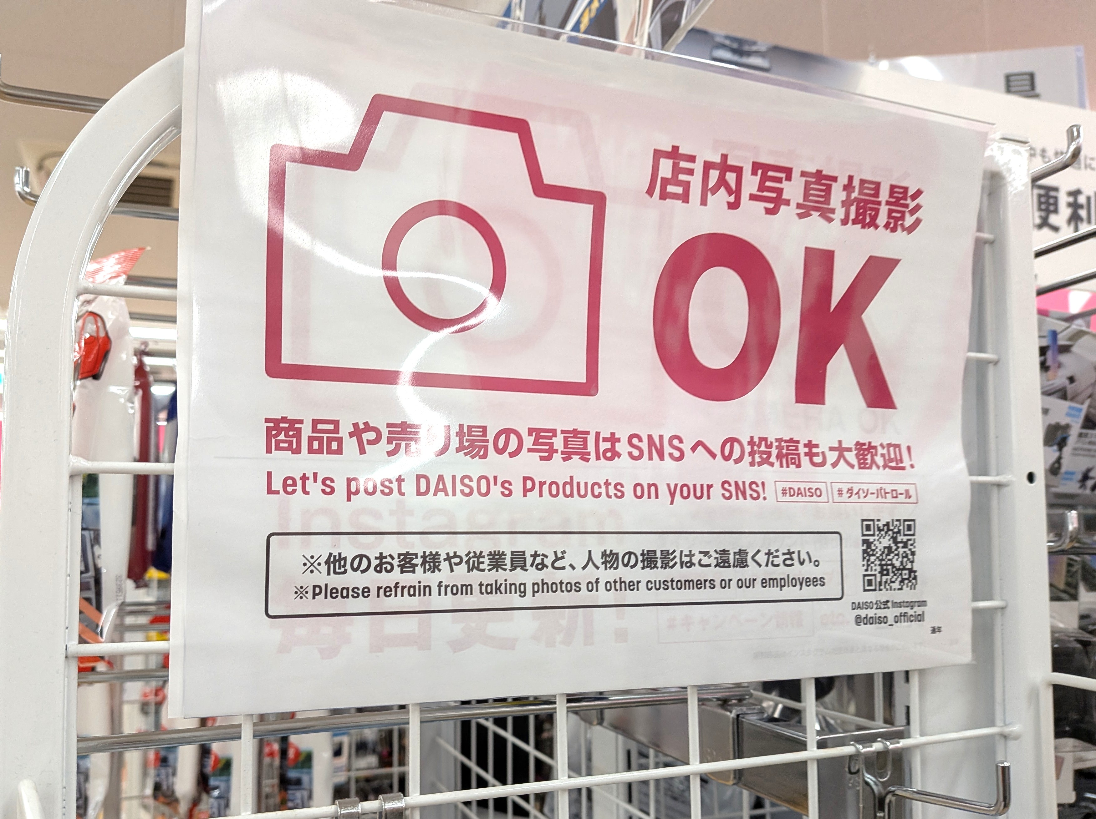 ダイソーの売り場内には【店内写真撮影OK・SNSの投稿も大歓迎】の掲示があり、店員さんにブログ掲載の確認をして許可をいただきました。