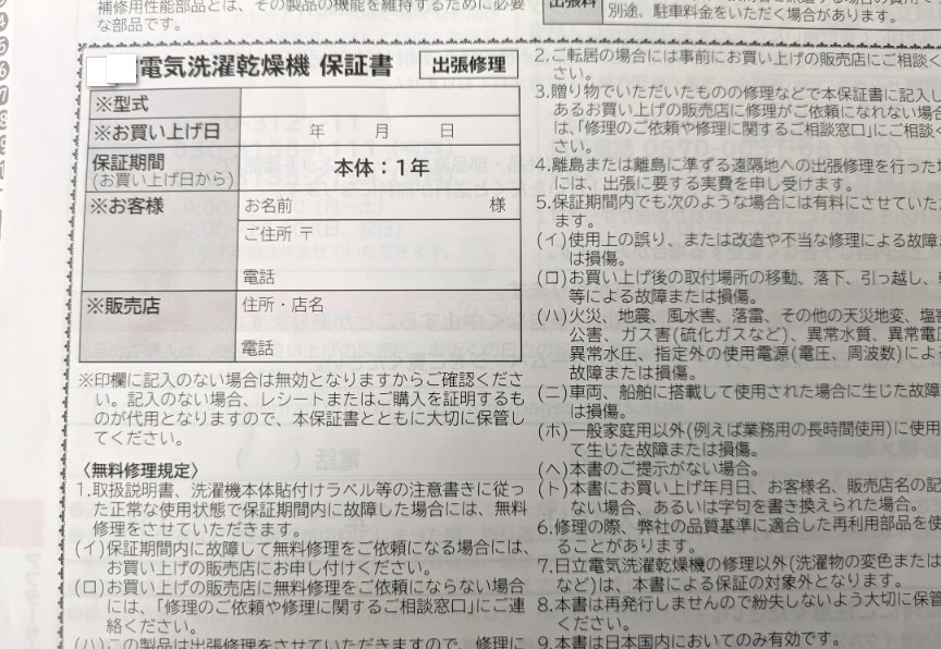 2022年に購入した洗濯機。購入場所は近所の家電量販店で購入レシートも残していましたが、保証期間までは書いておらず。その家電量販店のホームページを調べたところ、洗濯機は対象のメーカー・製品の物だけの保証で、保証期間も3年間、5年間の物があり、我が家はきっと該当しないと思って家電量販店には確認していませんでした。