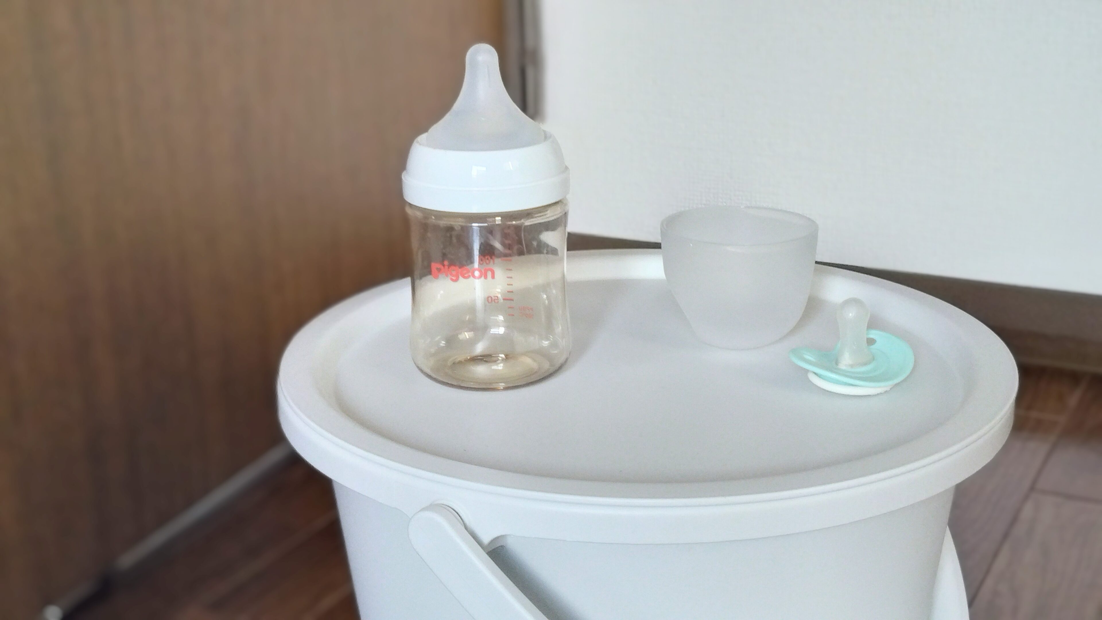 おむつバケツとして使っている我が家、オムツはいろんなところで交換します。その都度家のあちこちに移動させているのですが、どこに置いても馴染んでいるところがお気に入りです。バケツって青のイメージで存在感がある印象だったのですが、そんな常識が覆されたアイテムでした。