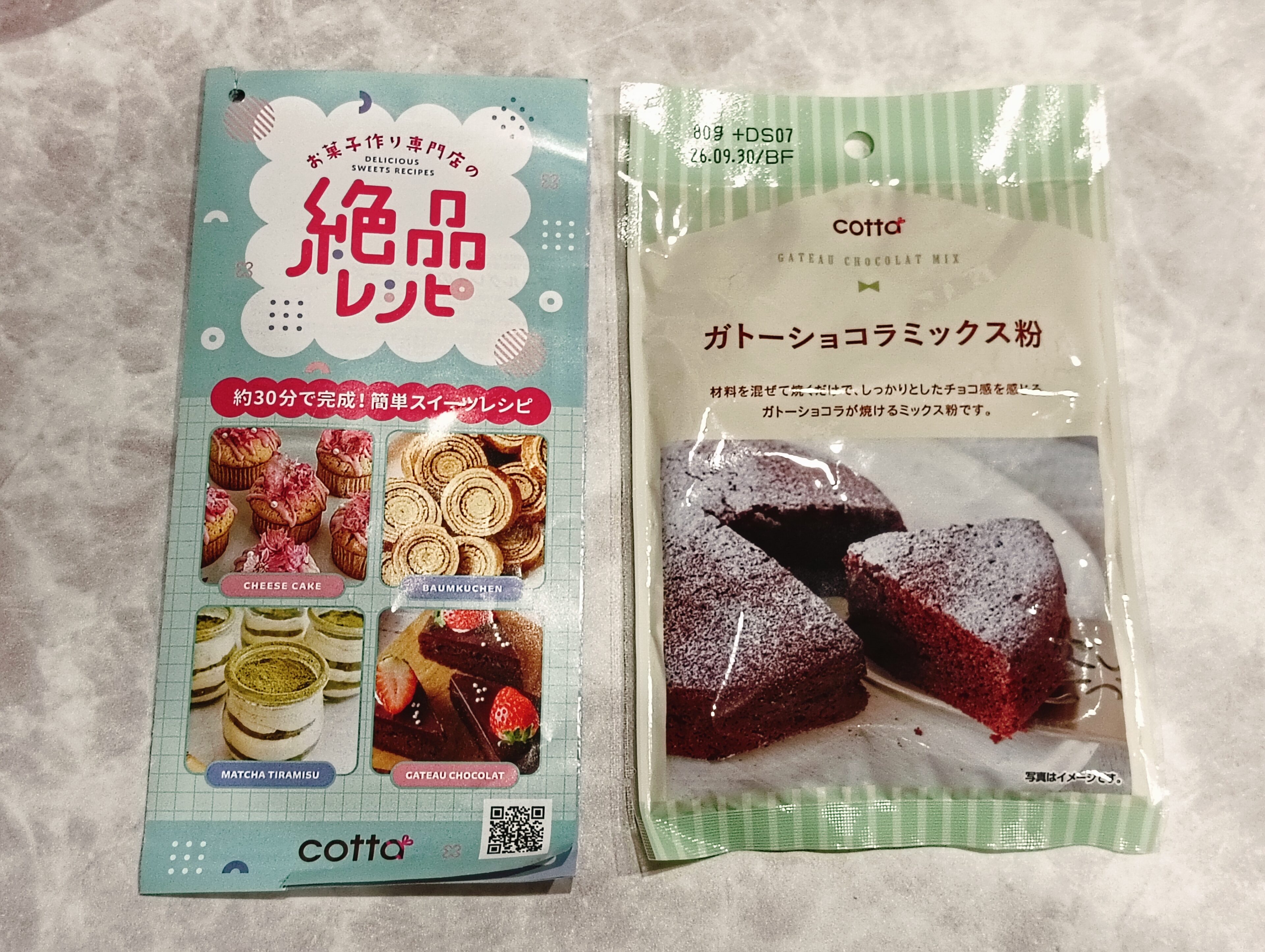 ダイソーのcotta監修の商品が置いてある近くに「絶品レシピ」というレシピ集があって、その中の【濃厚生ガトーショコラ】に惹かれ、ガトーショコラミックス粉を1袋購入したのですが、いざ作り始めてレシピをよく見ると、2袋使うレシピでした…。(ここまではあるある!? )