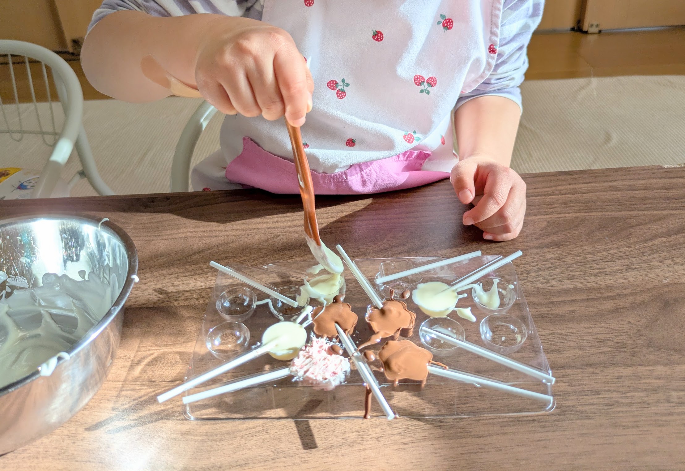 お湯でチョコレートを湯せんしているときは、正直ひやひやしましたが、4歳の娘も2歳の息子もお湯やチョコレートをこぼすことはありませんでした。チョコレートの量は控えめに感じましたが、結果として扱いやすく、こぼしにくかったです。