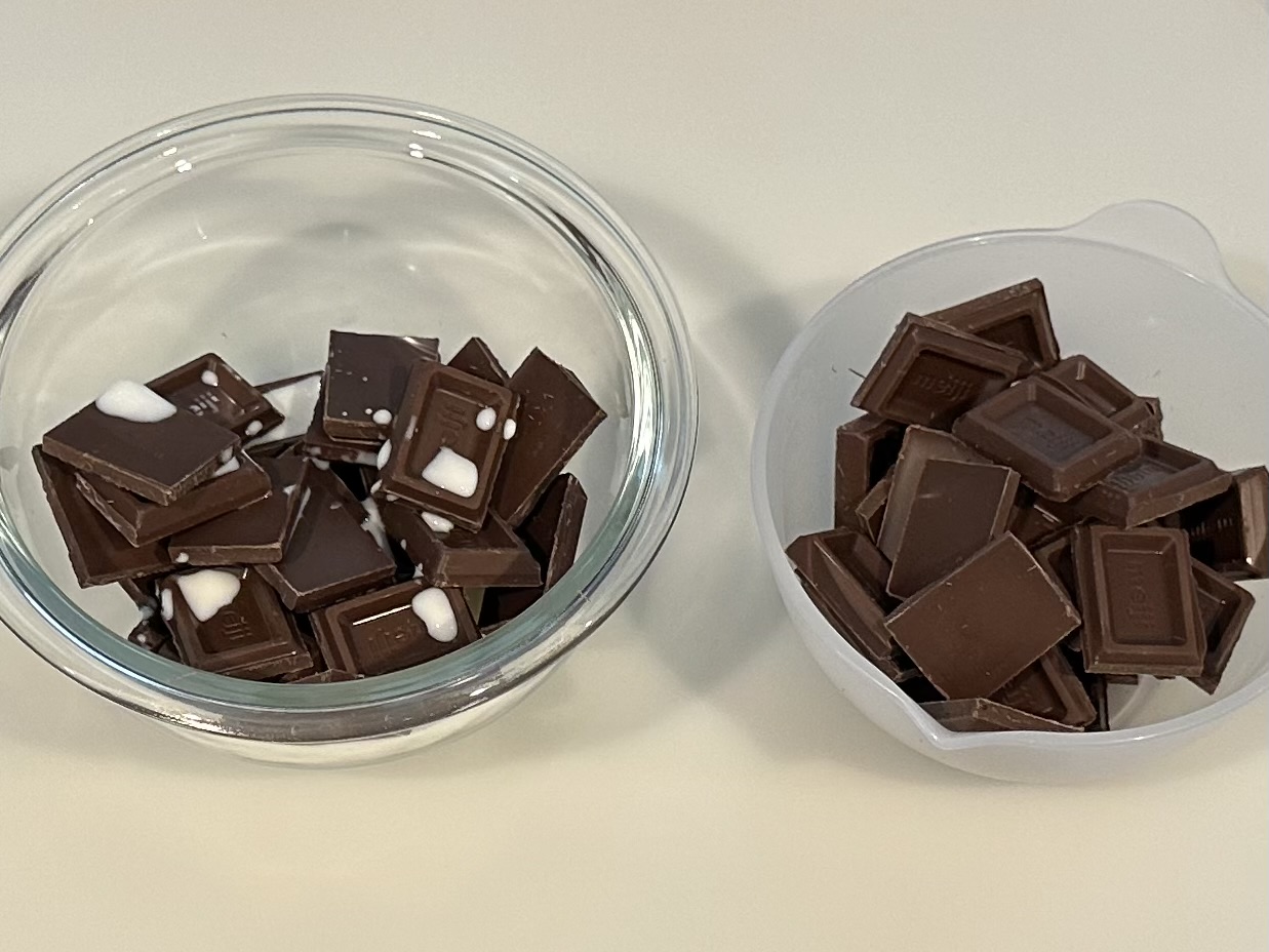 この後湯煎でチョコを溶かしますが、溶かしてから牛乳を加えると分離してしまう可能性があります。