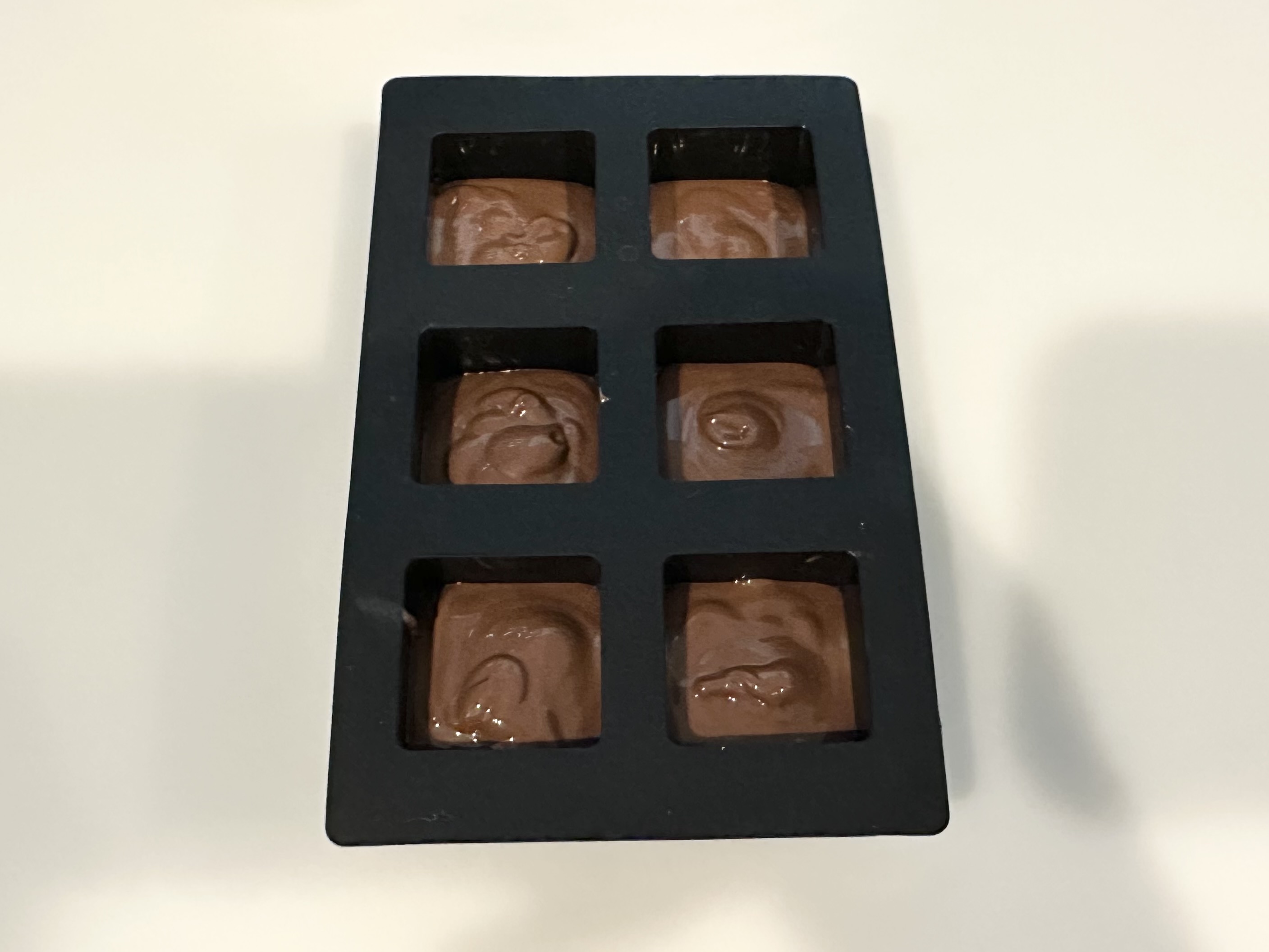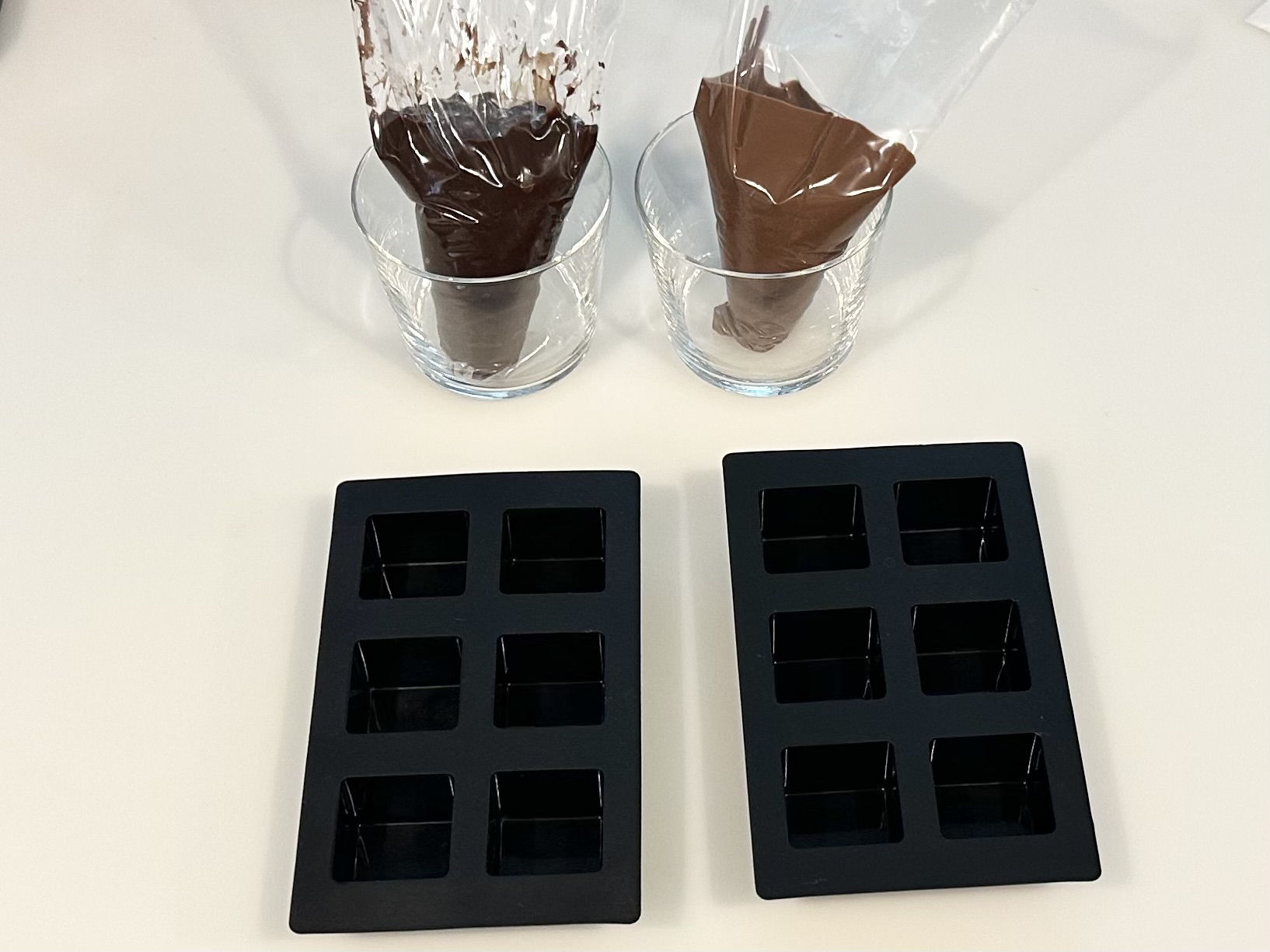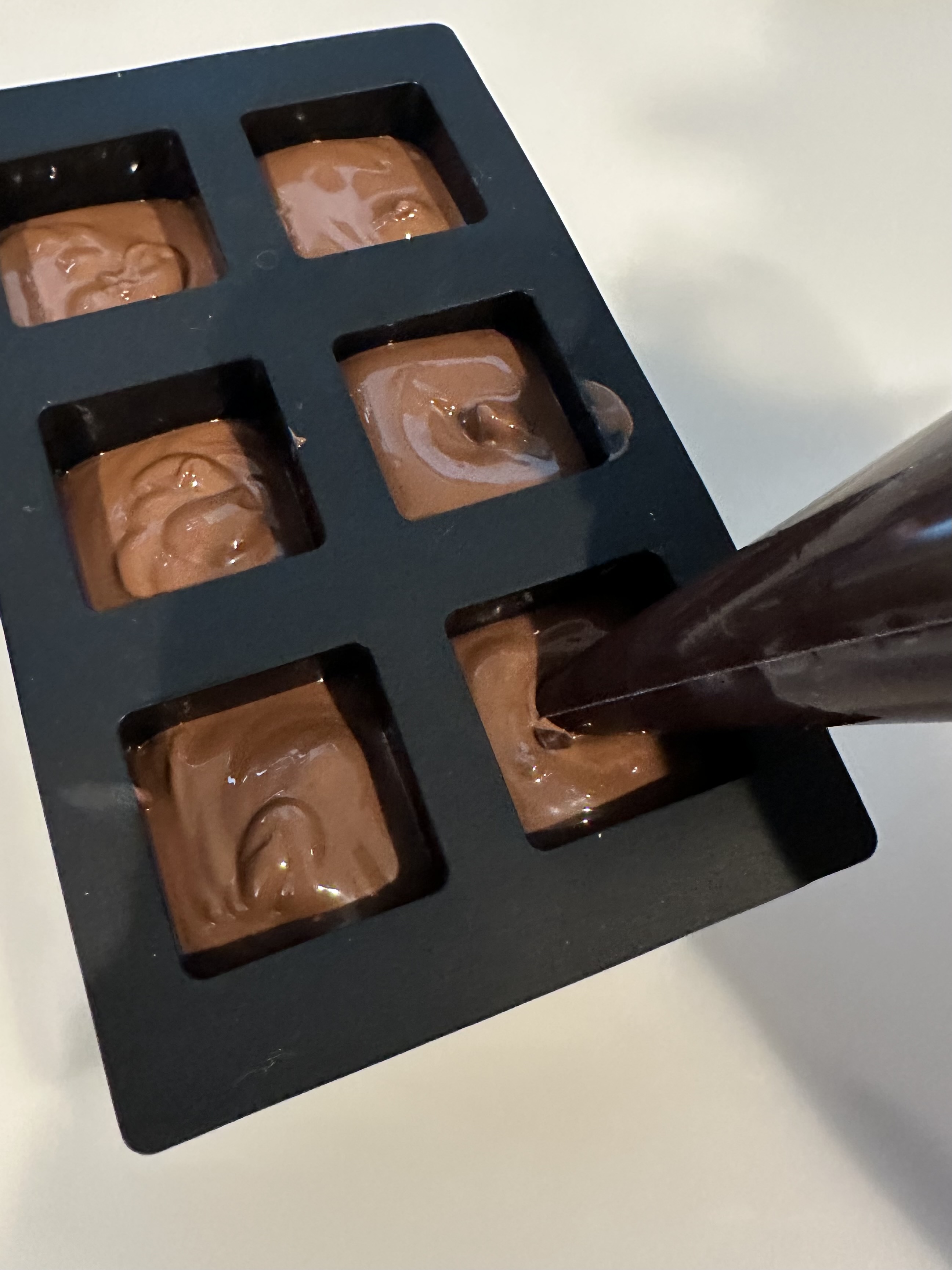 ・型の半分くらいの高さまでチョコのみの絞り袋を使って流し入れる。