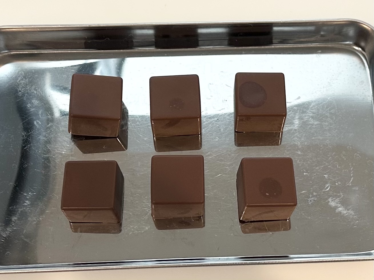 本来のボンボンショコラは、チョコを型に流し入れ、余分なチョコは取り出し、1度冷やし固め、ガナッシュを注ぎ、固め、最後にチョコで蓋をして固め…とっても手間と時間がかかるものです。