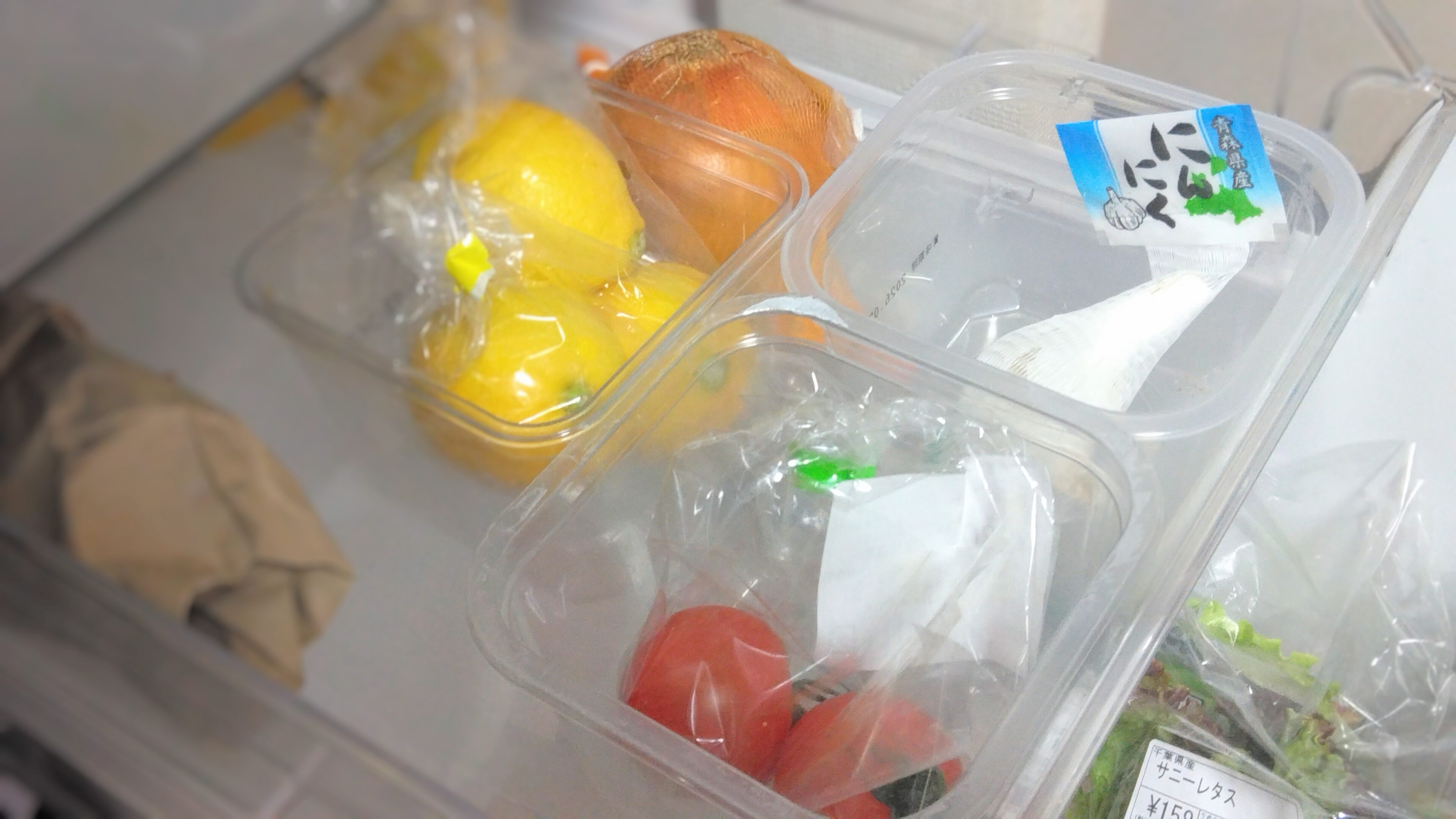 透明で頑丈、正方形(ほぼ立方体)で、程よい高さが魅力です。よく使う場所は冷蔵庫内、特に野菜室の上段。奥に追いやられがちな細々した野菜や、転がりやすい野菜を入れています。