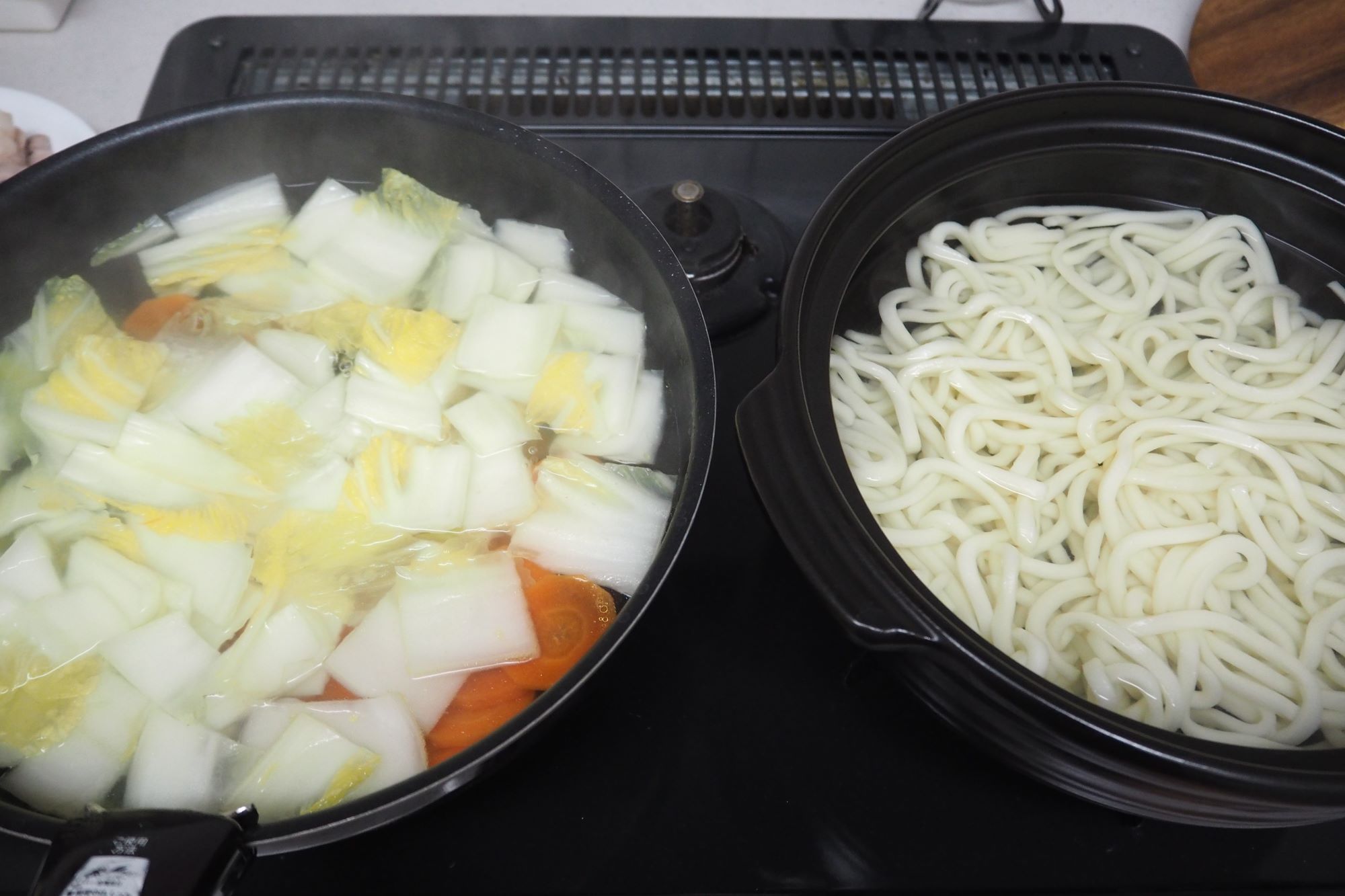 そこで取り入れたのが、具材ごとに火を通す方法です。薄切りの豚肉は別の鍋でさっと火を通し、野菜は火の通りにくいものだけを先に煮ます。鍋のほうではスープを準備し、うどんなどの麺類を先に煮ておきます。最後に下ごしらえした具材を盛り付け、豆腐などは余熱で温めれば完成です。