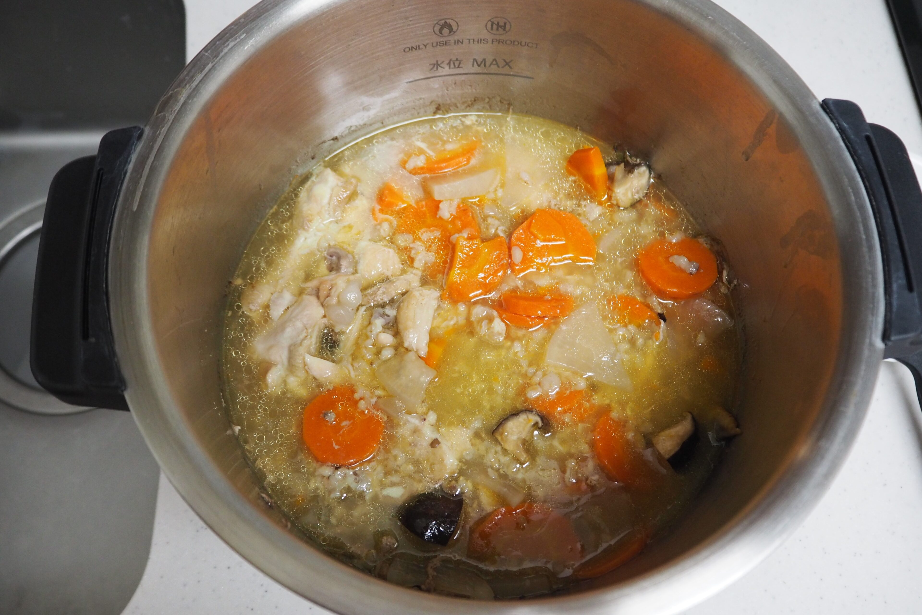 もうひとつ、寒い日におすすめなのが「参鶏湯(サムゲタン)」です。体を温める韓国の薬膳スープとして知られていますが、家庭で作るなら本格さにこだわらず、丸鶏の代わりに手羽元を使っています。下処理が簡単で火も通りやすく、鍋に手羽元と野菜、米を入れて水を注ぎ、煮るだけ。味付けは、ごま油を少しと、鶏ガラスープの素、塩で調整しています。