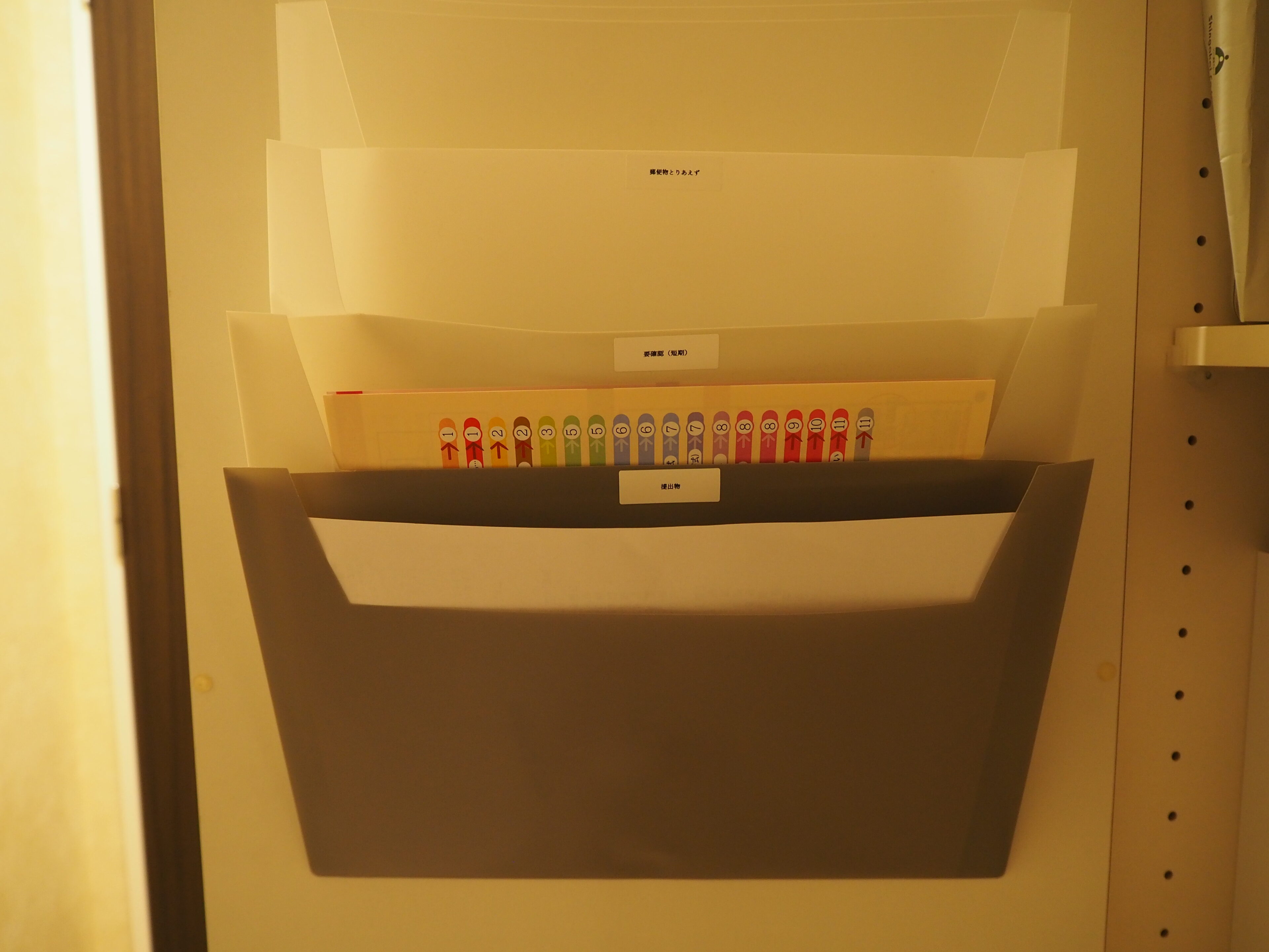 廊下の収納の扉の裏側には、吊り下げ式のスライドファイルを付けています。