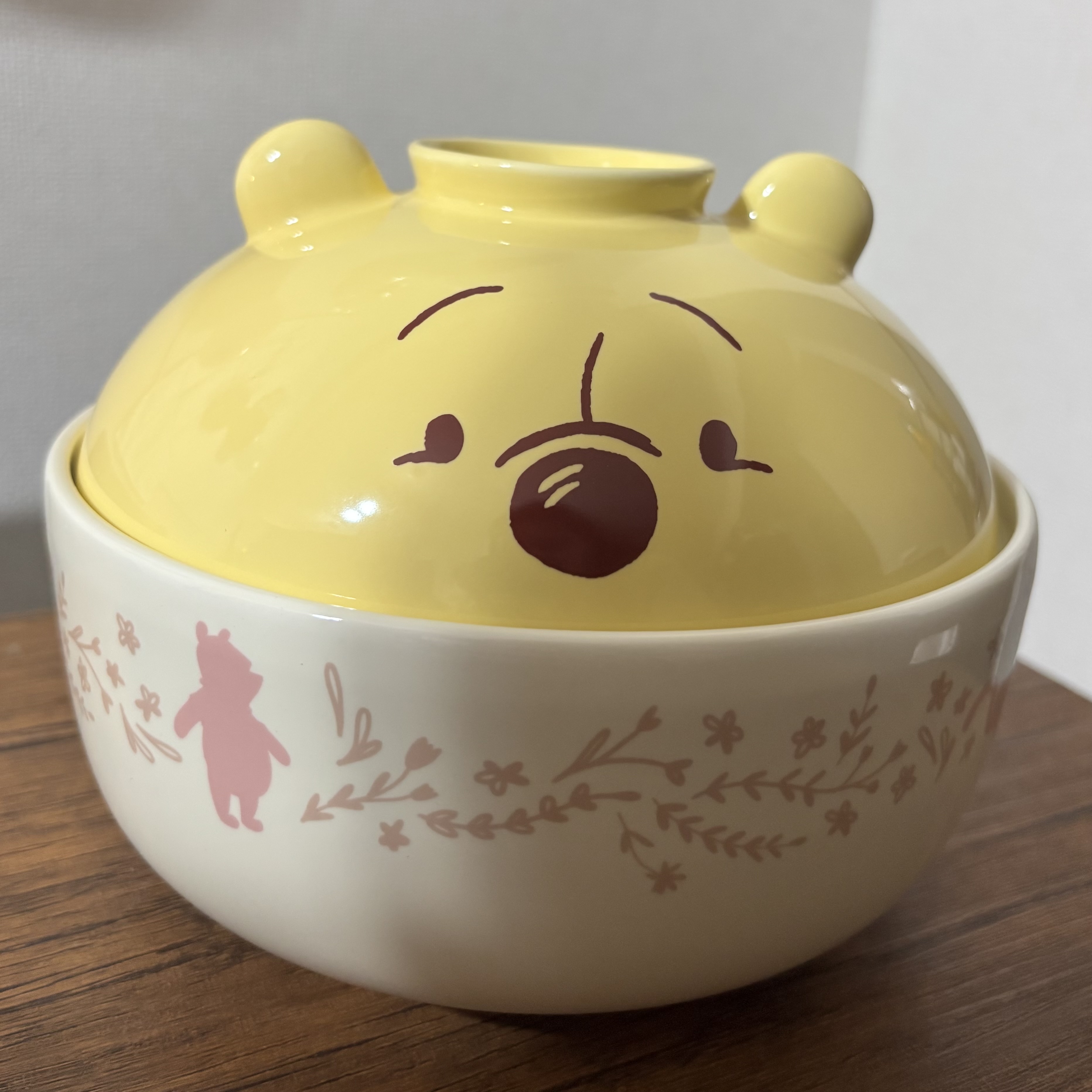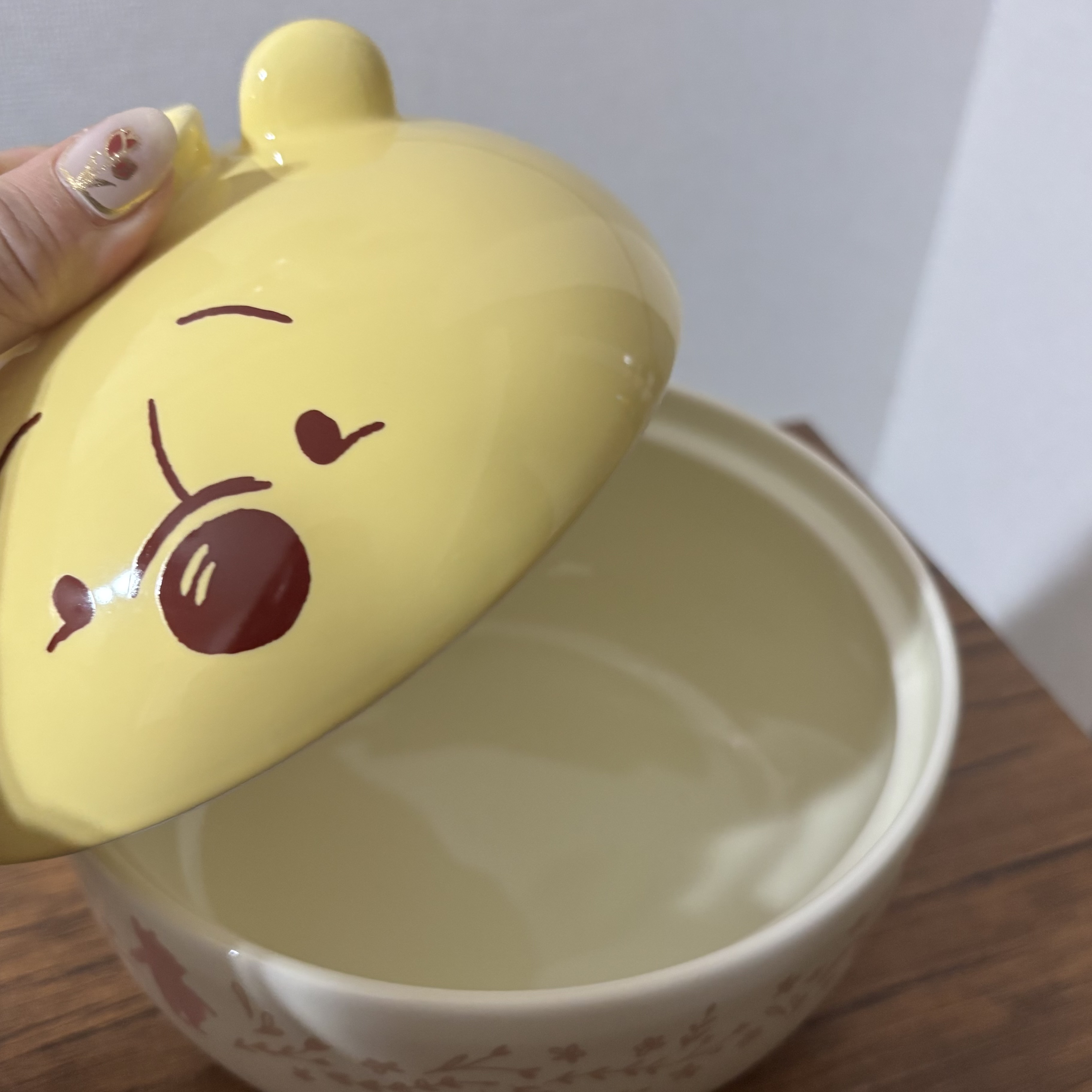 フタの部分はプーさんの可愛いお顔が立体的に再現された陶磁器製ボウル。17cmとサイズ感もしっかりで実用性がバッチリ、ご飯時間に大活躍しそうなアイテムです。本当に可愛いので使うのが楽しみです!
