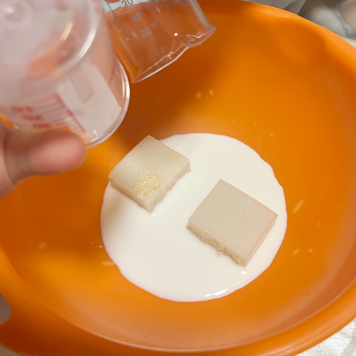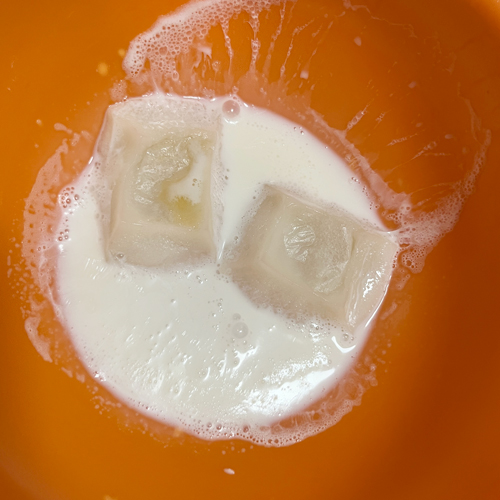 1.耐熱容器に切り餅・牛乳・砂糖を入れ、500Wの電子レンジで約1分30秒加熱します