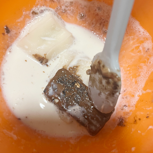 2.加熱した(1)にブラックサンダーを加え、ヘラでよく混ぜます