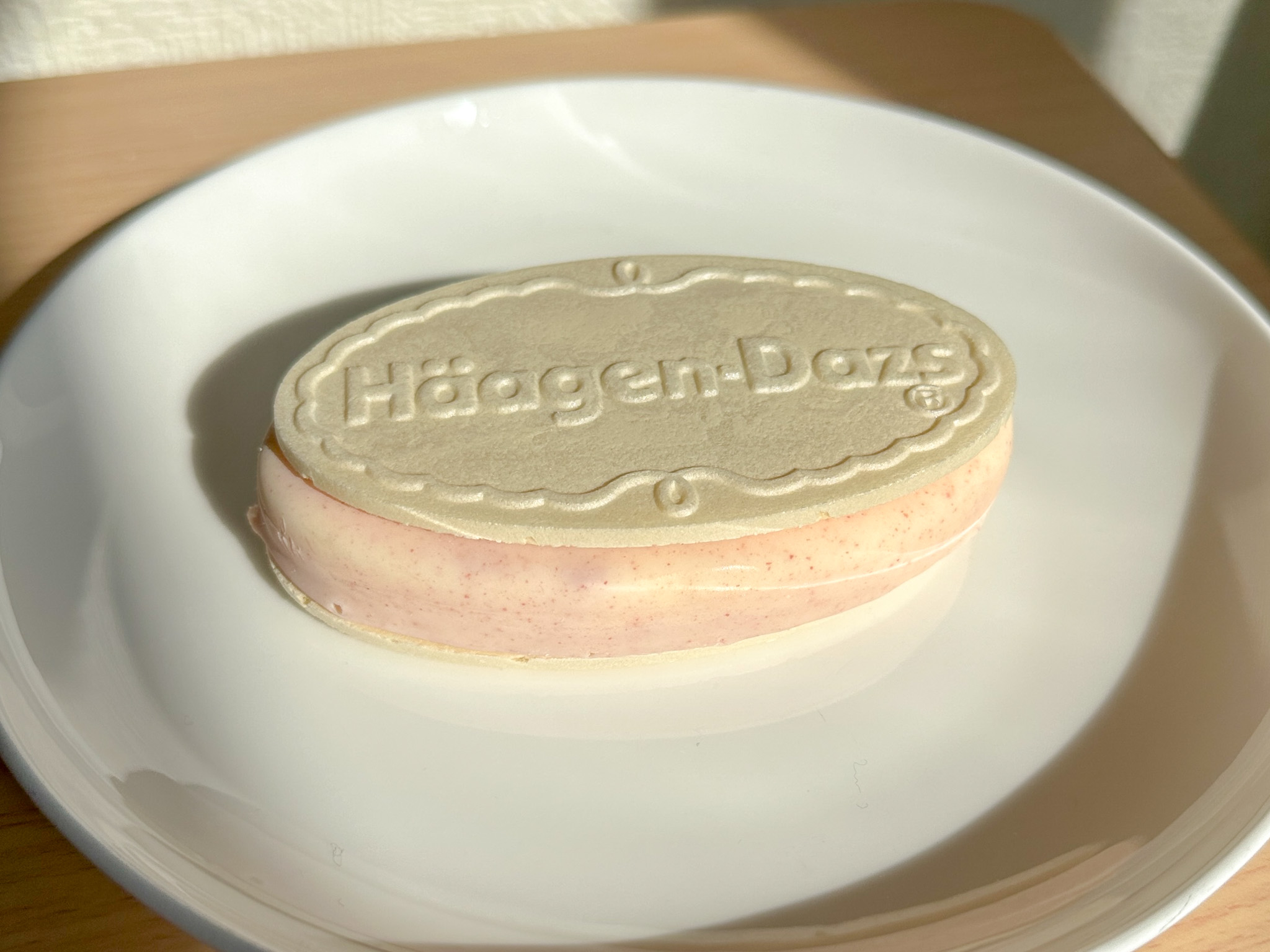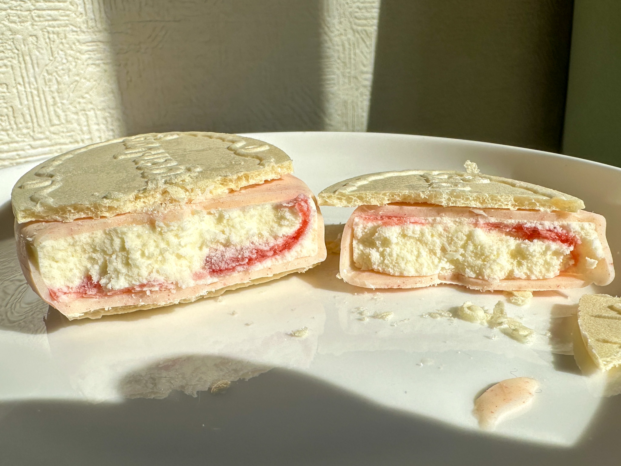 さらに外側には、いちご果肉パウダーを使ったいちごコーティング。食べた瞬間にパリッと弾け、やさしいいちごの香りが広がります。個人的にはこのいちごコーティングのチョコレートが1番のお気に入りでした!そして全体をサンドしている真っ白なホワイトウエハース。とろけるアイスと相性がよく、サクサクと軽やかな食感が最後まで続くクリスピーサンドの代名詞です。