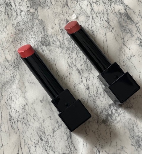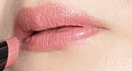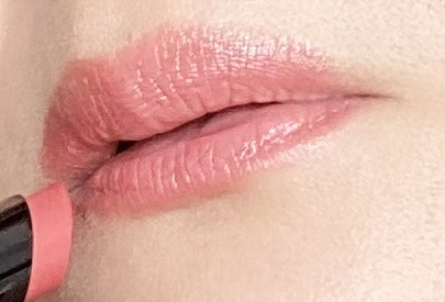 ニュートラルなピンクで、ややくすみ感のあるロゼピンク系。大人っぽい印象です。アラフォーの私には、こちらの方が発色がやや落ち着いていて使いやすそうだなと感じました。