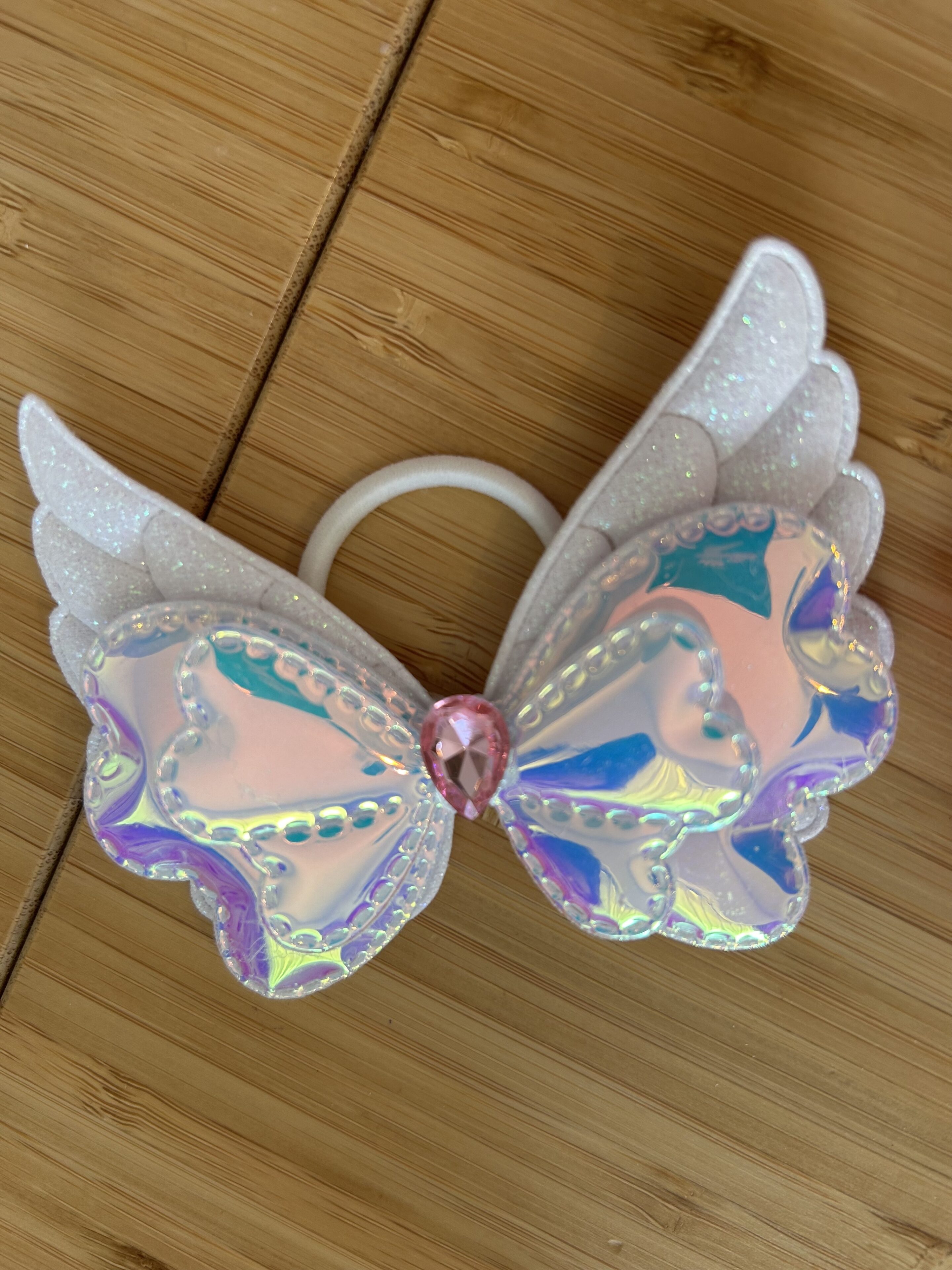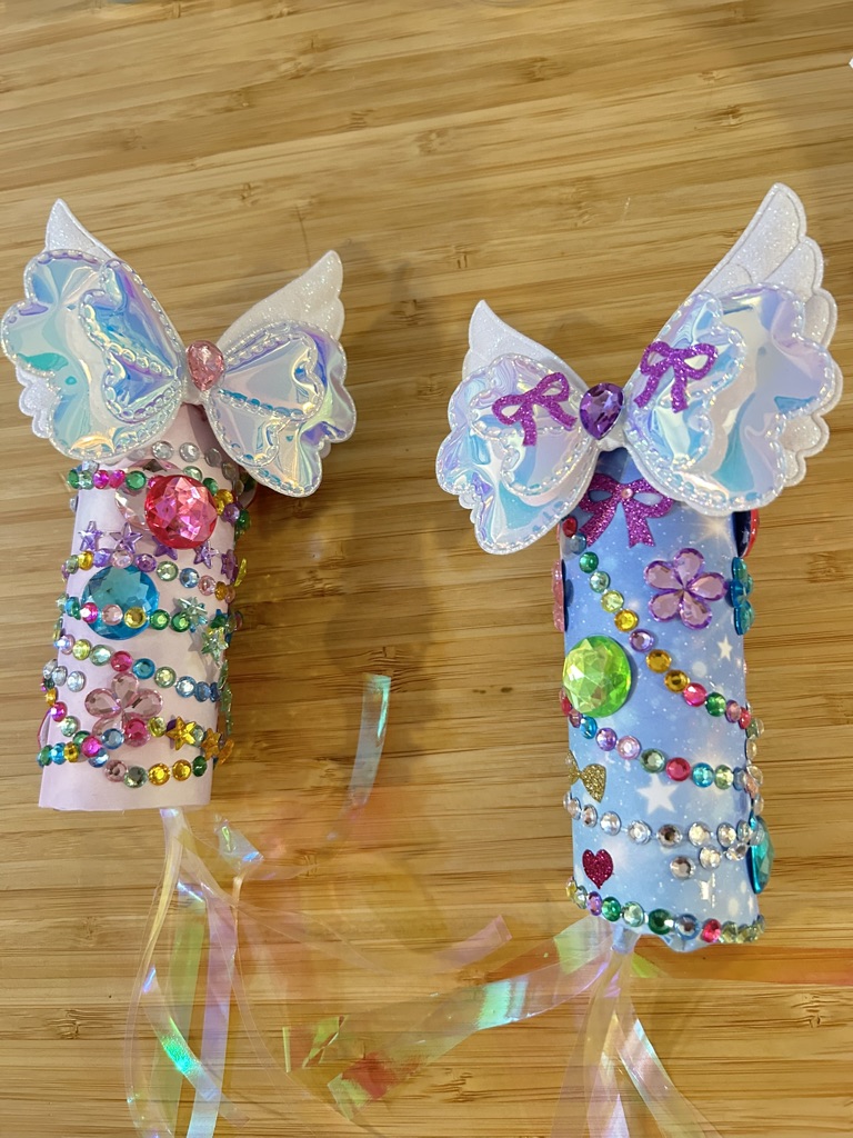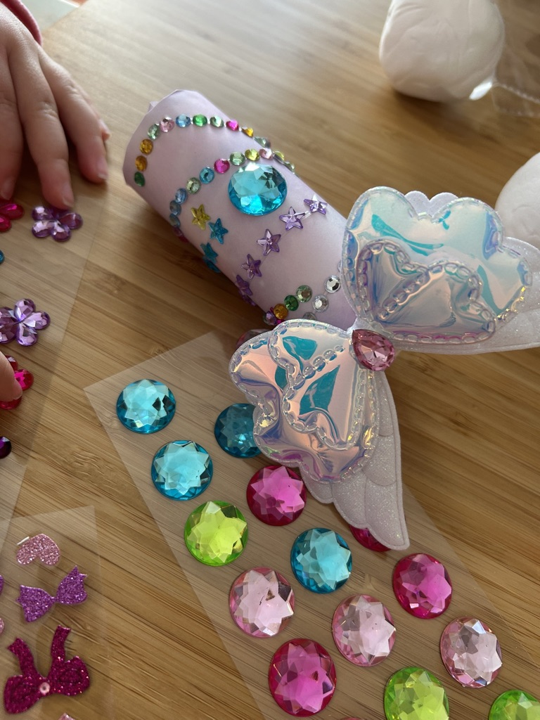 (2)羽根ゴムを取り付けた後、キラキラシールでデコレーション!