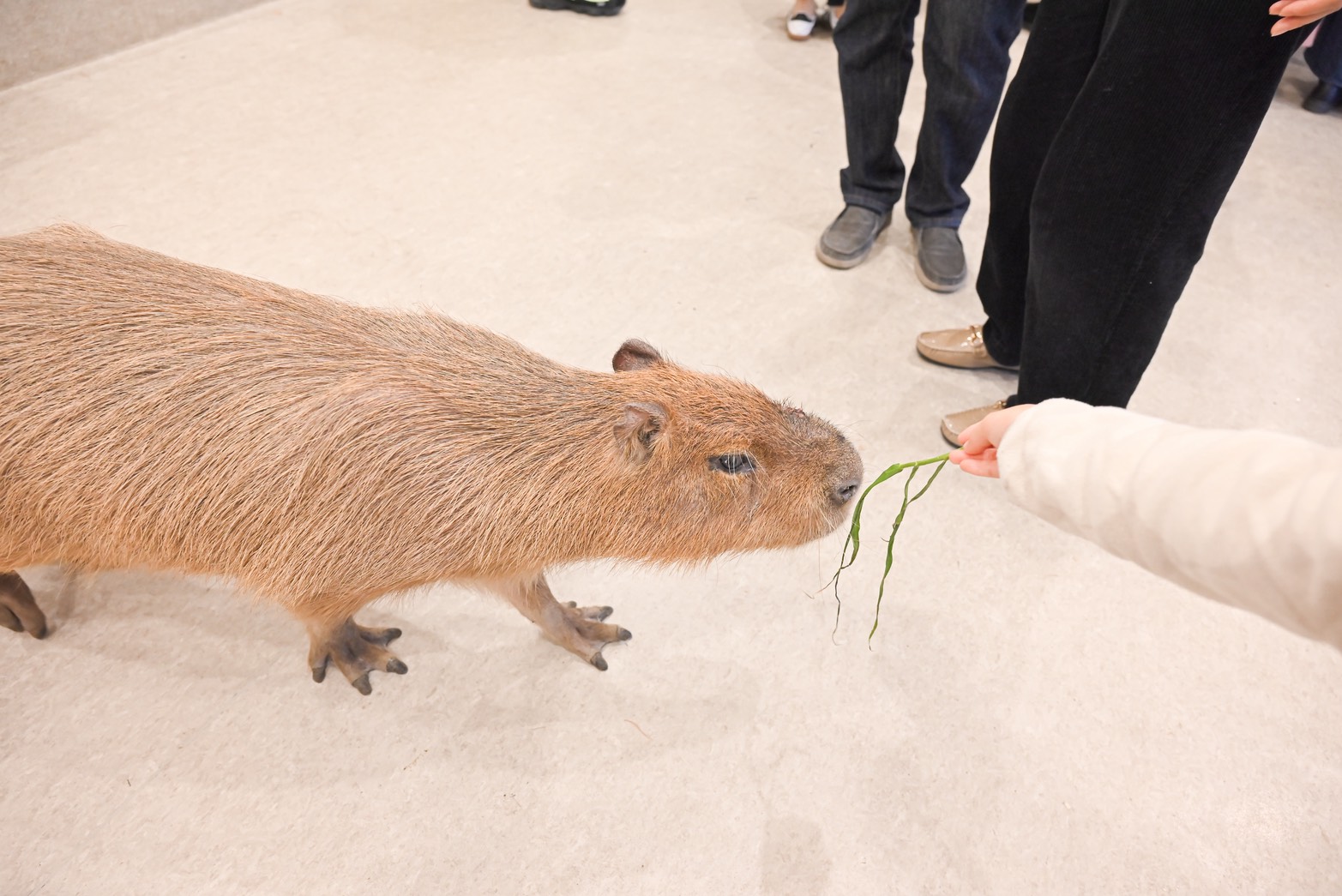私の娘は最初、カピバラの大きさに驚いて少し怖がっていましたが、最後にはやさしく背中をなでなでしていましたよ。
