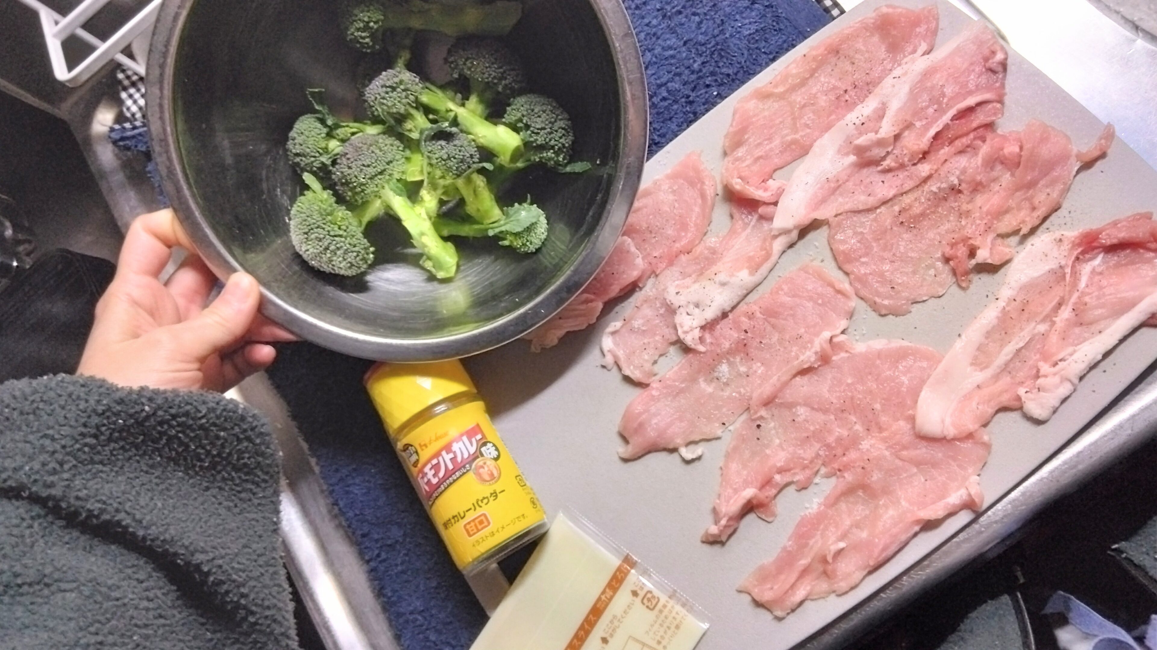 4.スライスチーズを乗せ(今回は細かくちぎっていますが、1枚ドーンでも良し)、カレー粉を振る