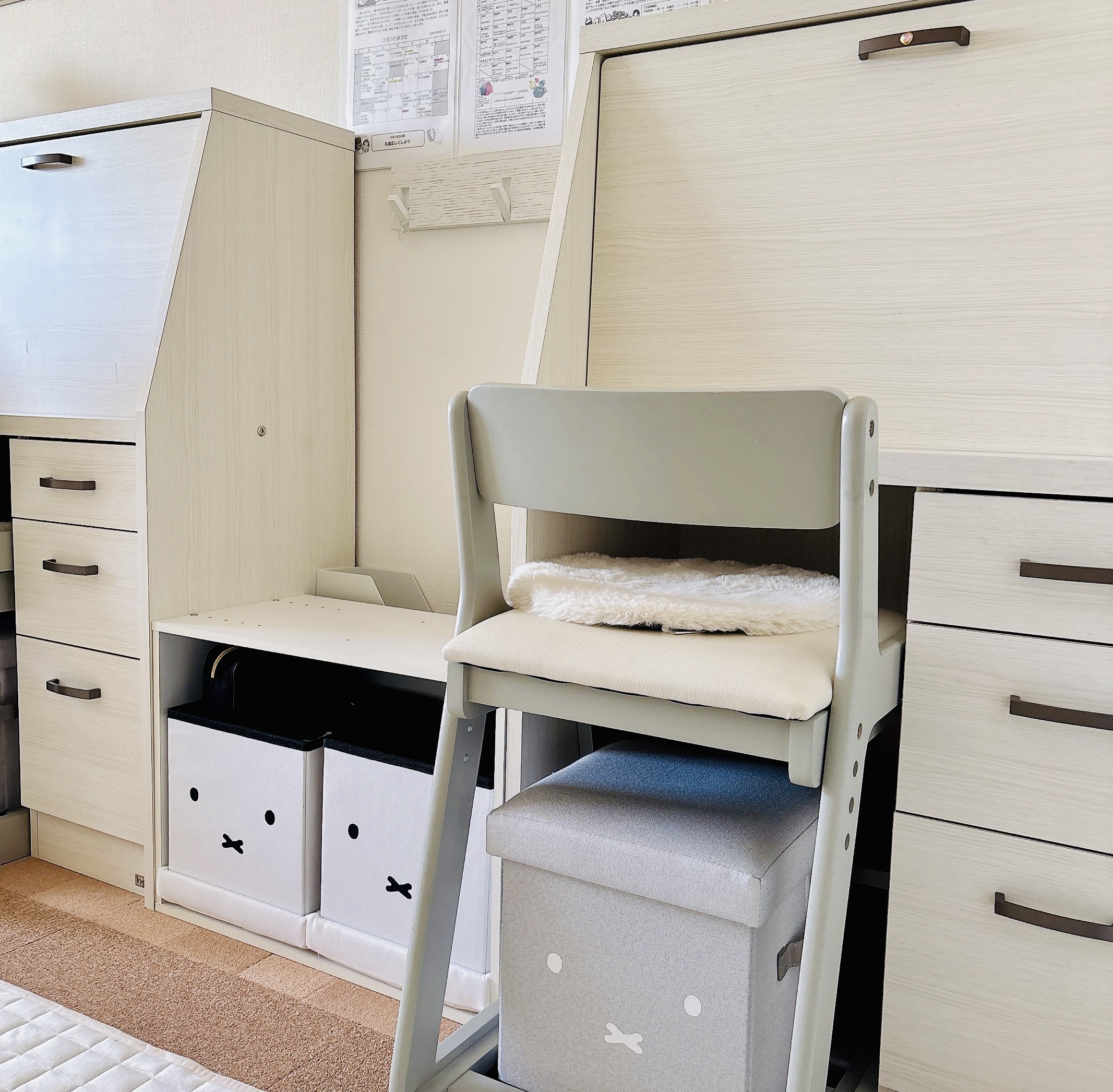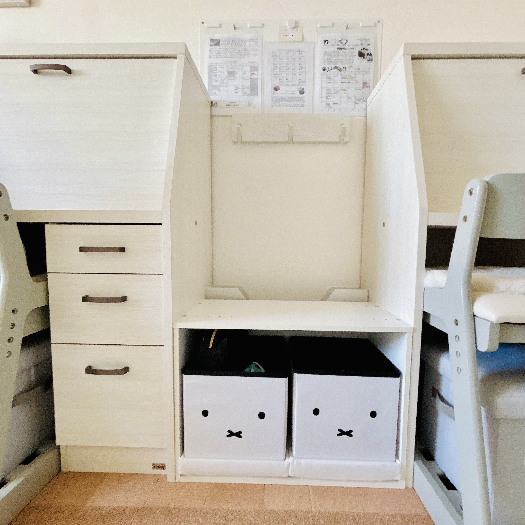下はカラーボックスの空間を上手く利用して、収納場所としています。真ん中の仕切りを外して、スツールを2つ入れています。このボックスには学用品を収納。絵の具や習字セット、上履き、体操着等、入れています。