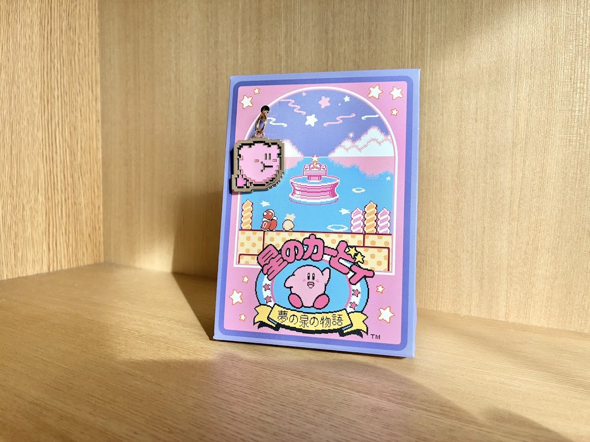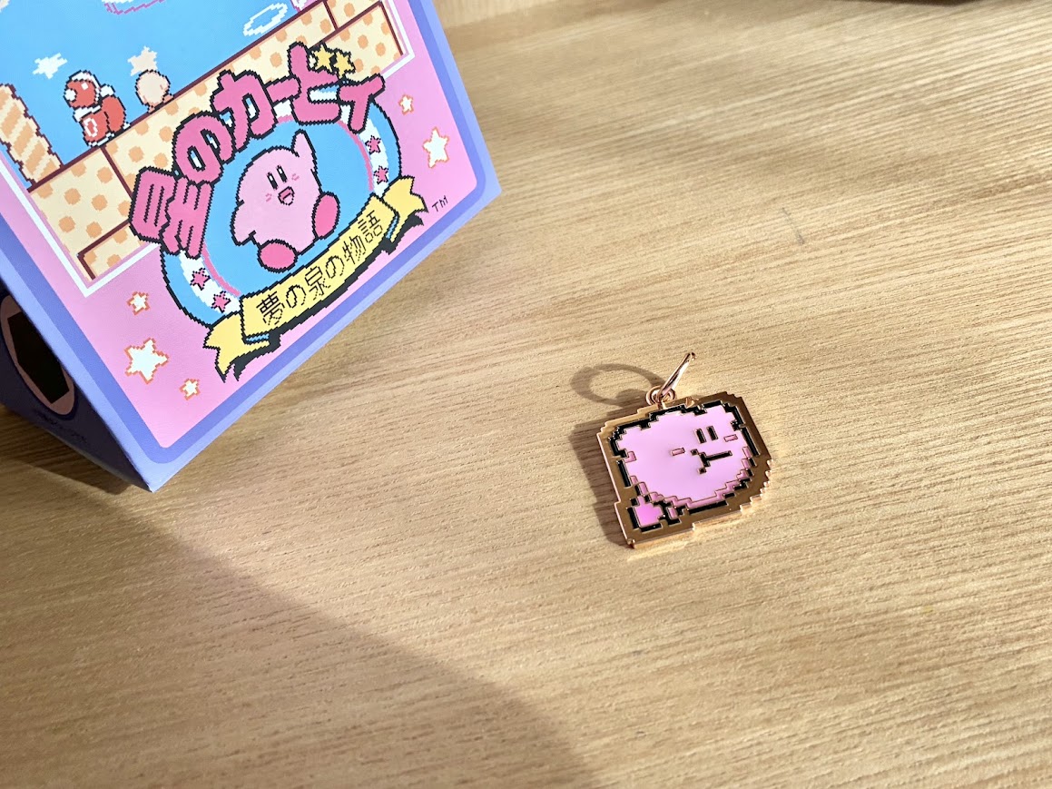 なつかしのドット絵で描かれたカービィが、金属製のチャームになってゆらゆら揺れています!