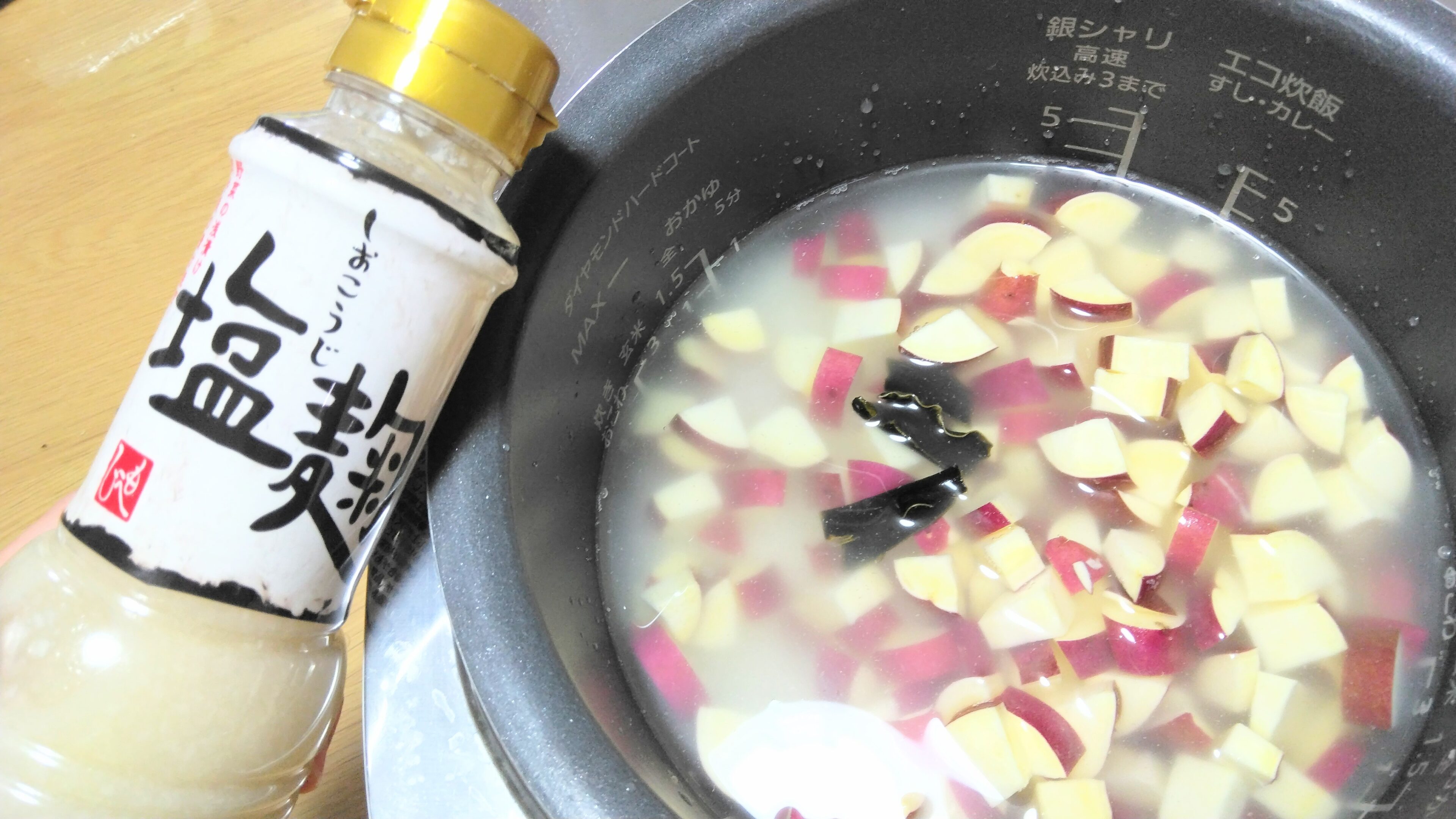 また「さつまいもごはん」も味付けは昆布と塩麹だけ。お米3合に対して大さじ3ほど。以前は塩をひとつまみ入れており、それでも十分美味しかったのですが、塩麹のほうが栄養面でも魅力があり、まろやかな味わいになる気がしています。