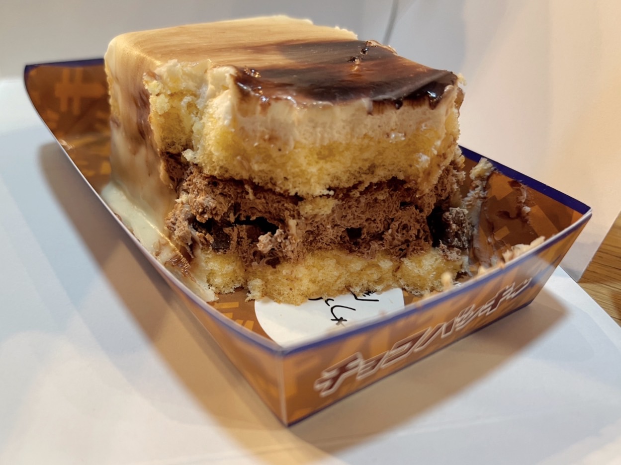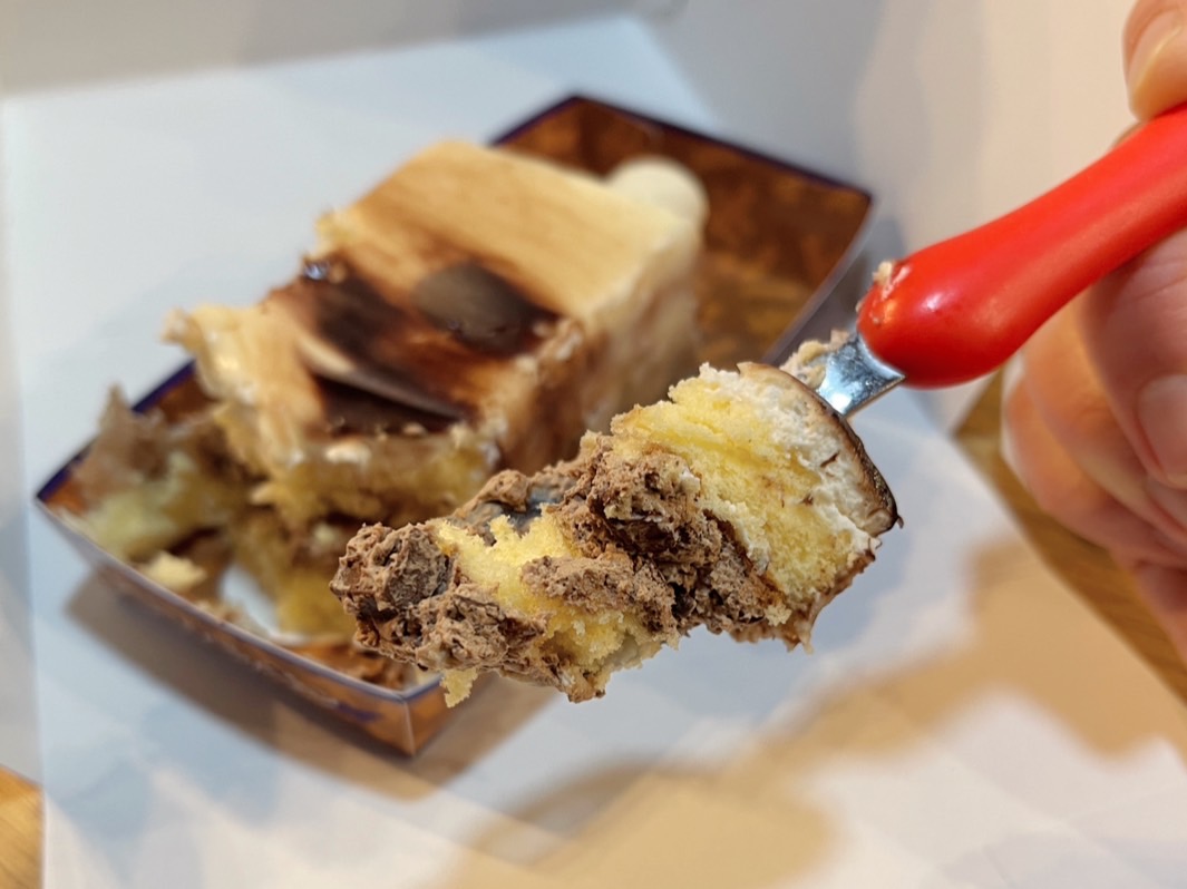 見た目は「チョコバッキー」でありながら、中身は本格的なケーキ?早速フォークを入れてみると、フワッフワ!ですが、一口食べてみると、チョコバッキーの特徴である「パリッと」「ゴリっと」「ゴロっと」した異なる食感のチョコレートが、スポンジに挟まれたチョコクリームにたっぷり。食べ応えも抜群です。
