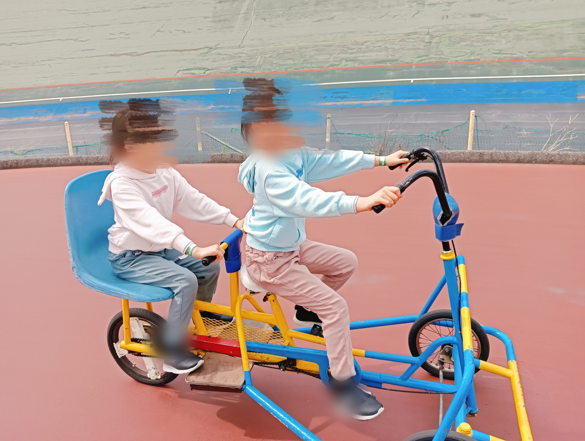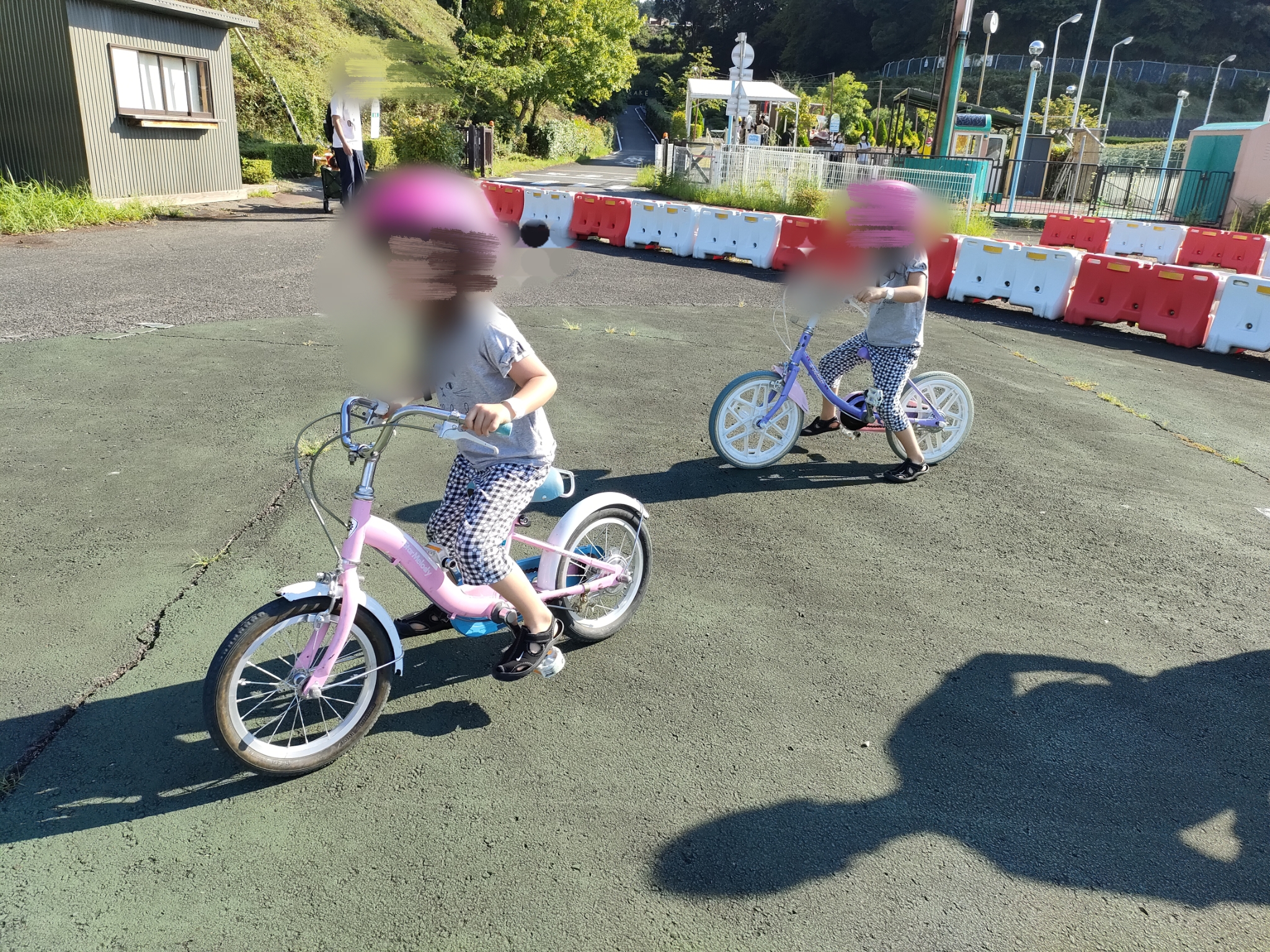 ここには、色んなおもしろ自転車が乗れる場所や、初心者向けの広い自転車練習広場があります。広いし、安全で、思う存分遊べる環境が最高の場所です。練習広場では、他の子もみんな練習しているので、双子も刺激され、真剣モードに。
