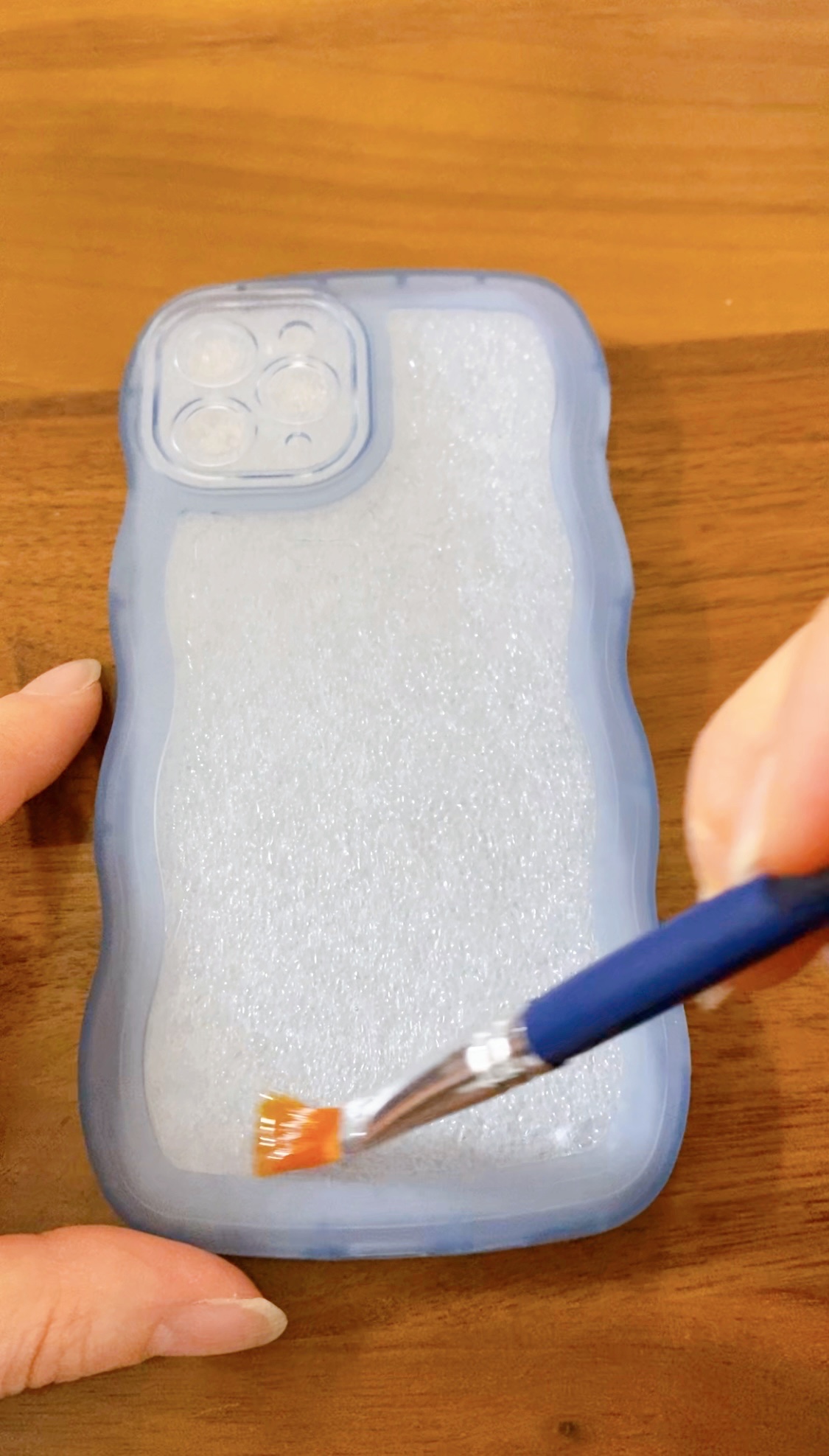 (1)スマフォケースにレジンを流して筆で薄く伸ばしていきます