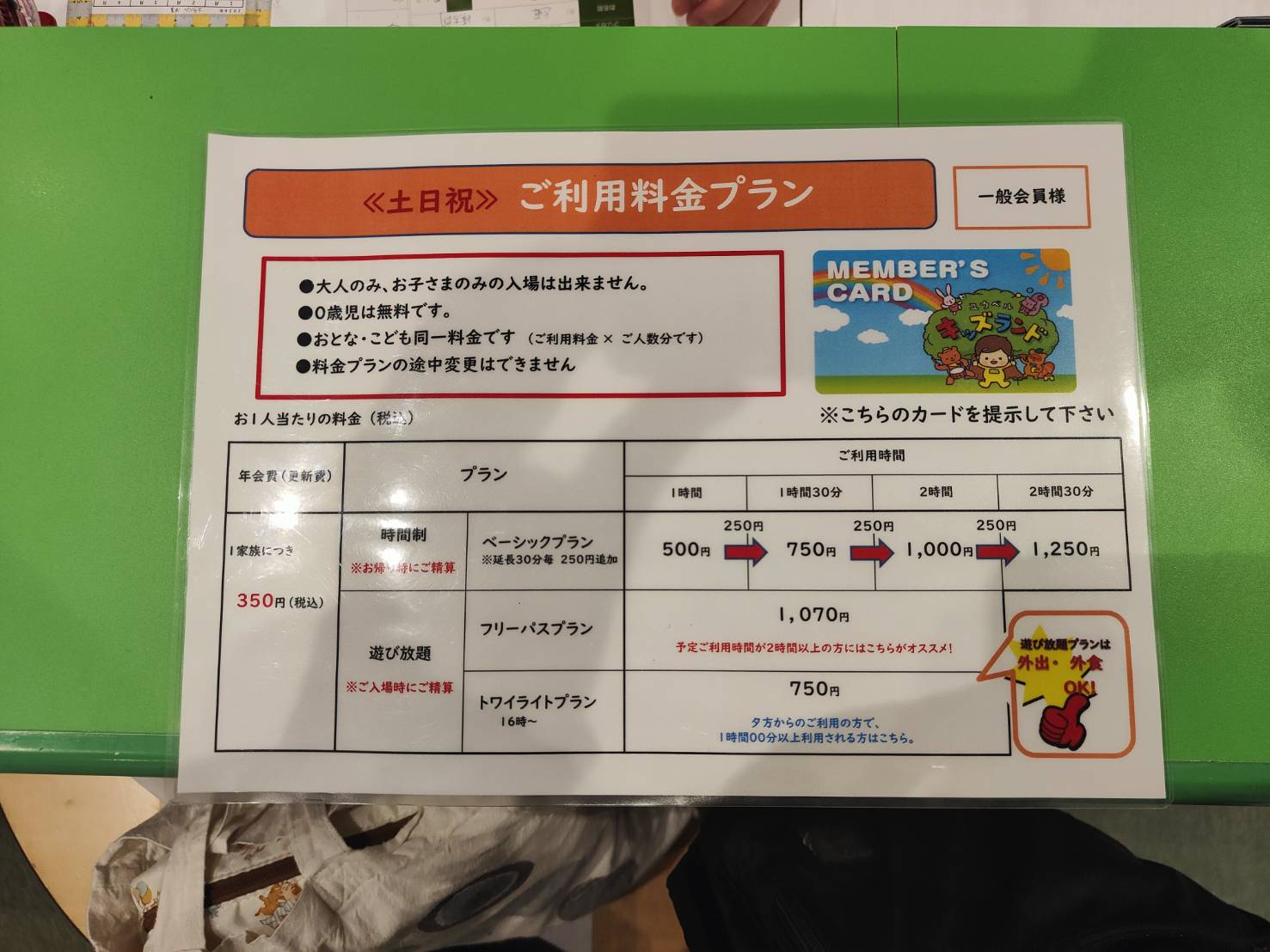 入会金:350円(1家族) 利用料:子ども750円+大人750円(1時間半)=合計1,850円
