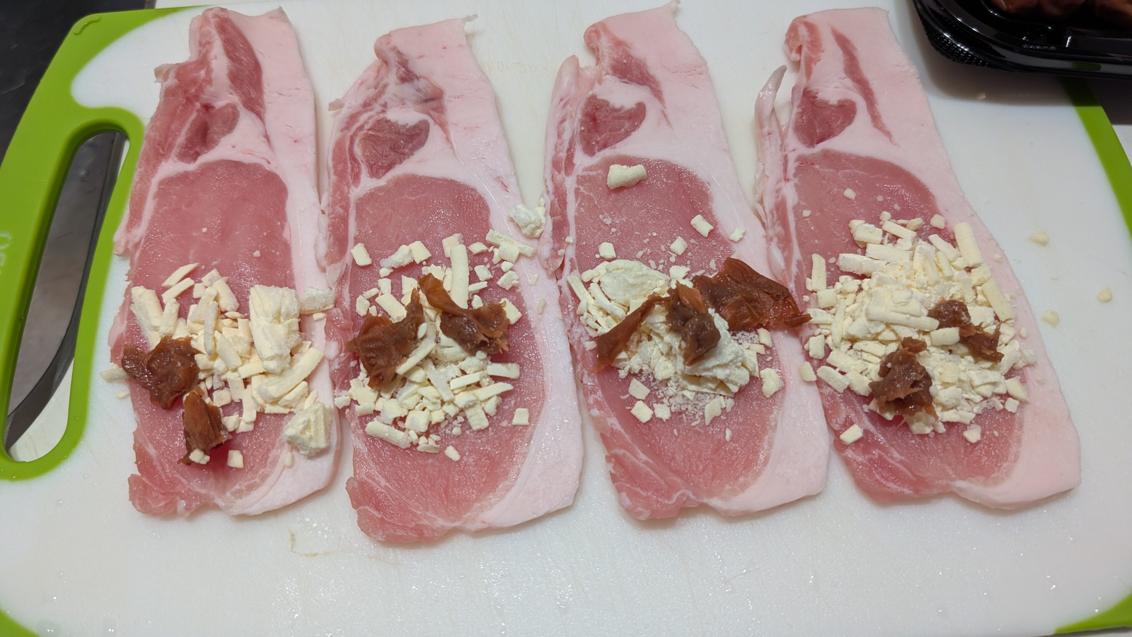 豚肉を広げて軽く塩コショウをし、具材を重ねていきます。