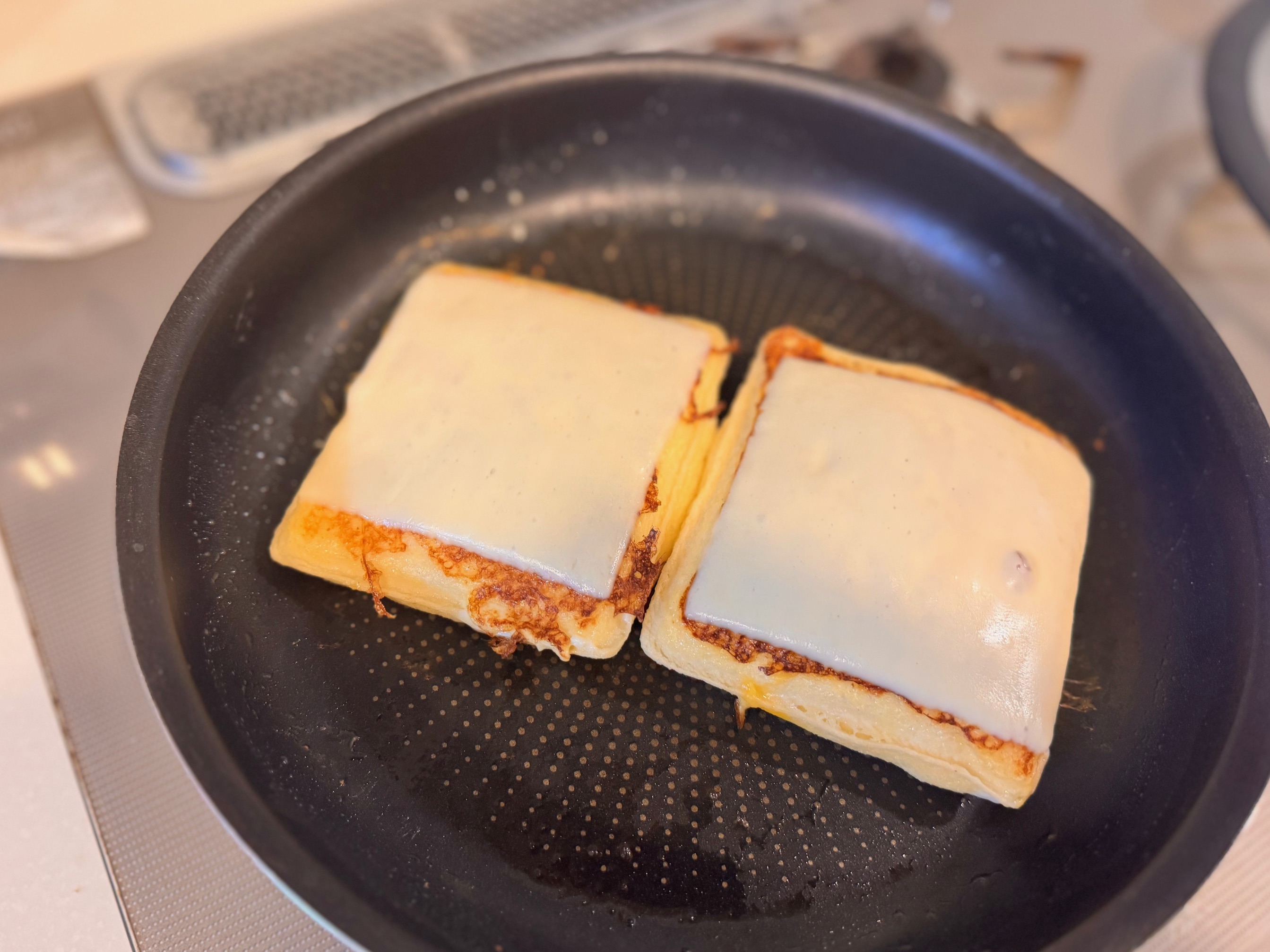 (2)フライパンにバターを溶かし、弱火でじっくり焼きます。裏返したら上にとろけるスライスチーズをのせ、フタをして蒸し焼きに。チーズが溶けたら完成です。