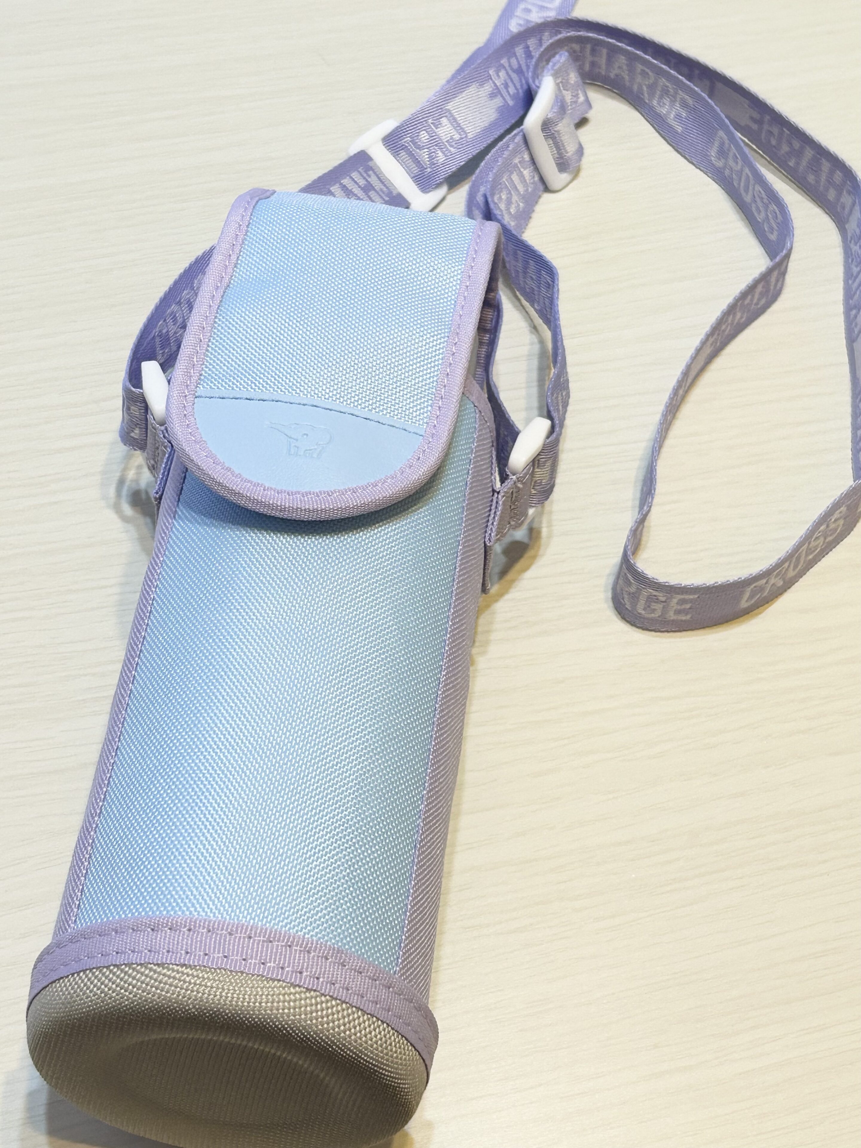 持ち運びに便利なショルダーベルトがついたボトルカバーもありました。ふたを保護し、マグを入れたままでも自立するので快適です。