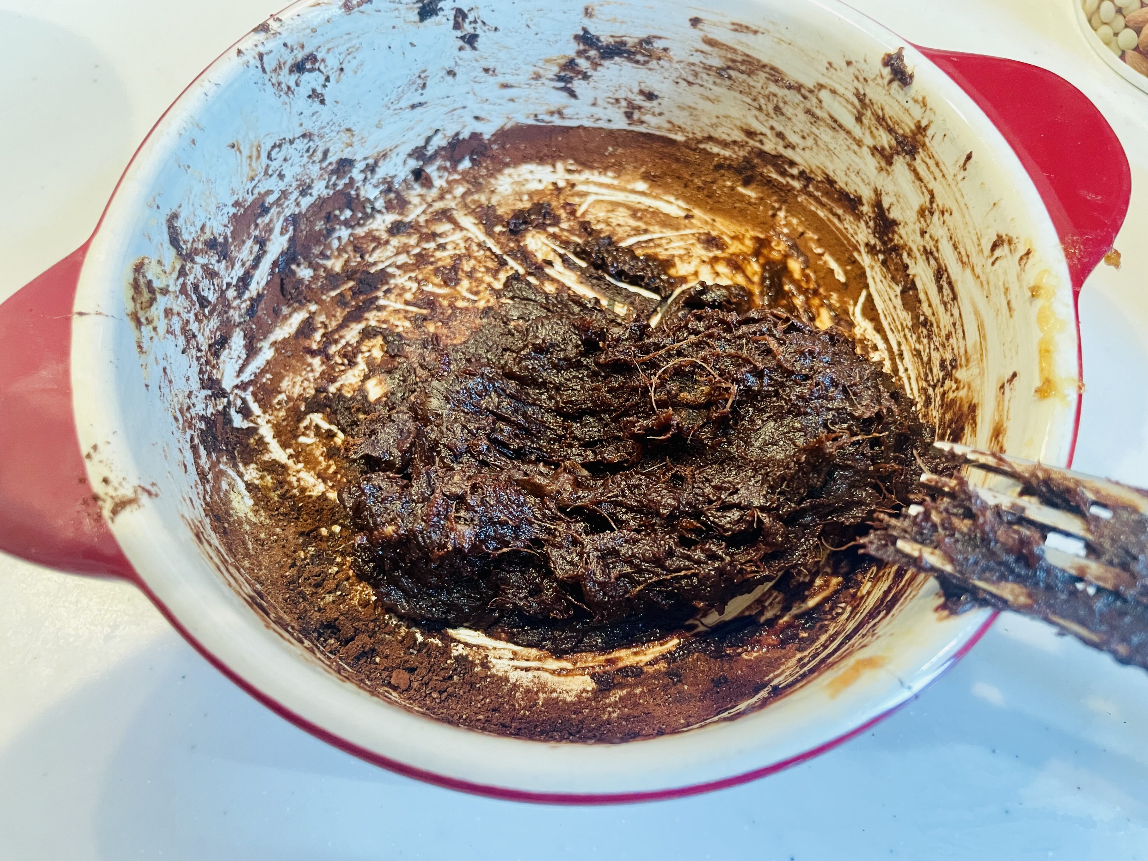 (3)潰したデーツに、ココア・牛乳を混ぜる(ここで固ければ、牛乳を少し足します)