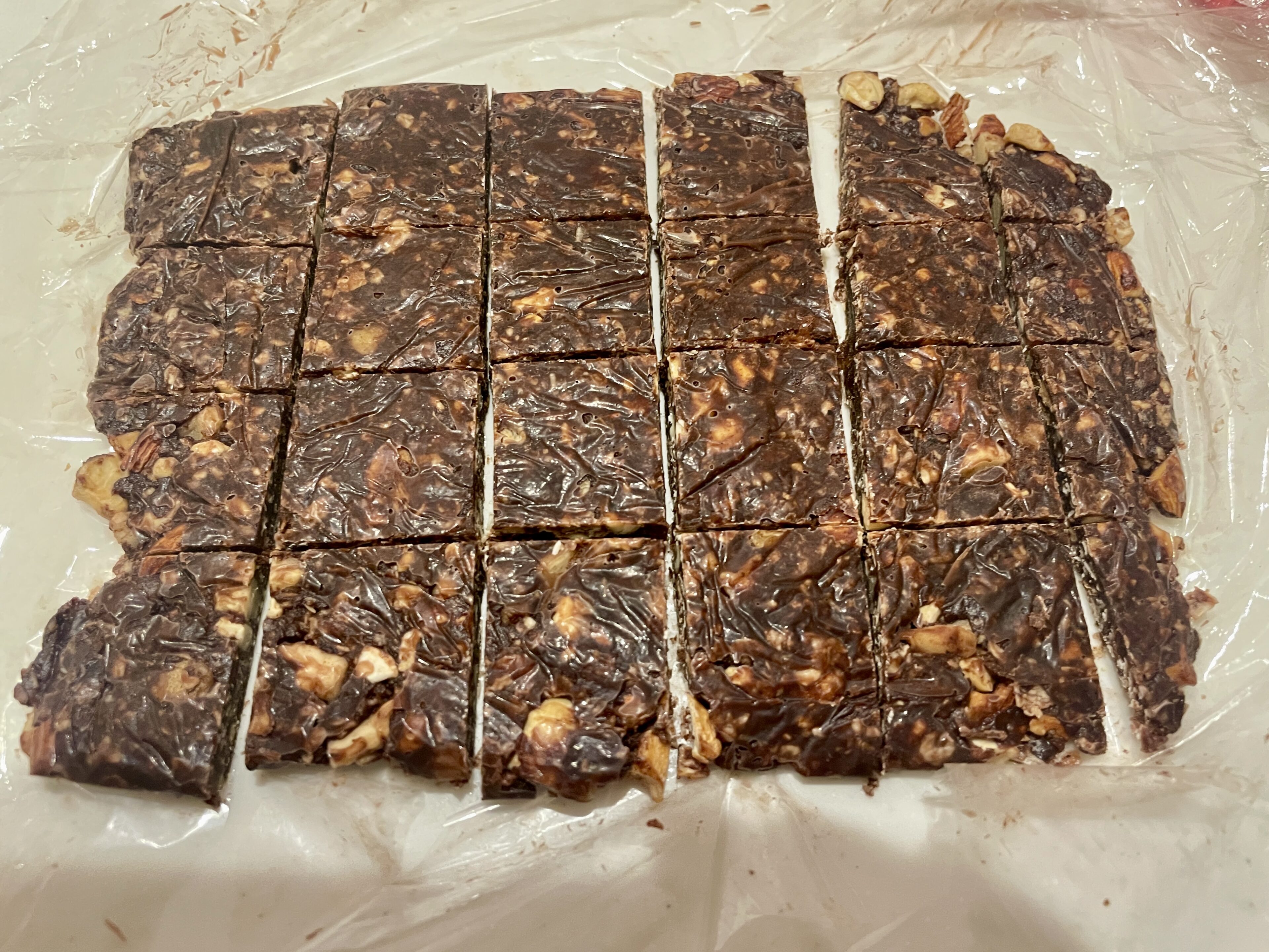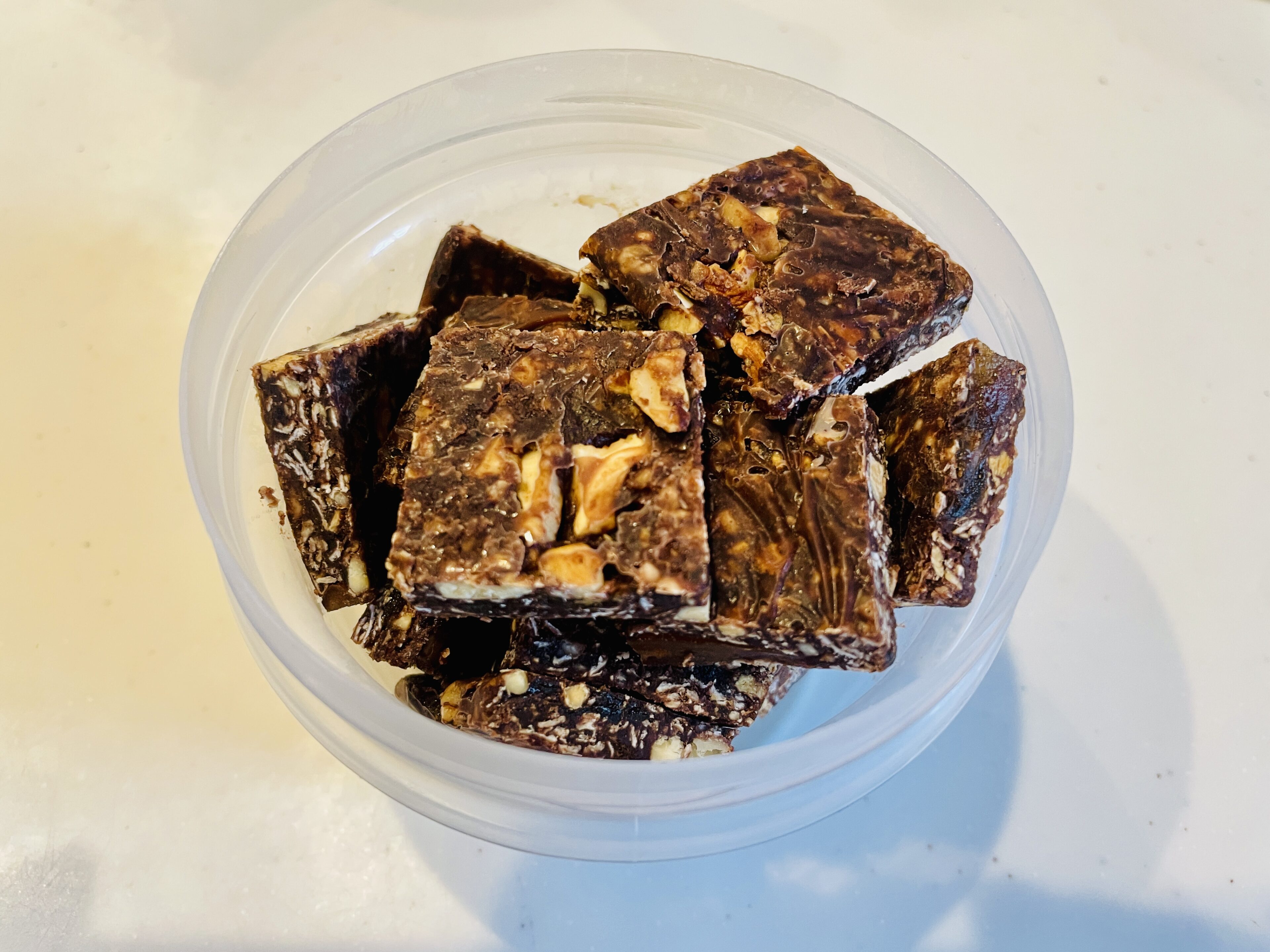先ほどの生チョコ風レシピにココナッツオイルとオートミール、ナッツ等を組み合わせて冷やし固めると、