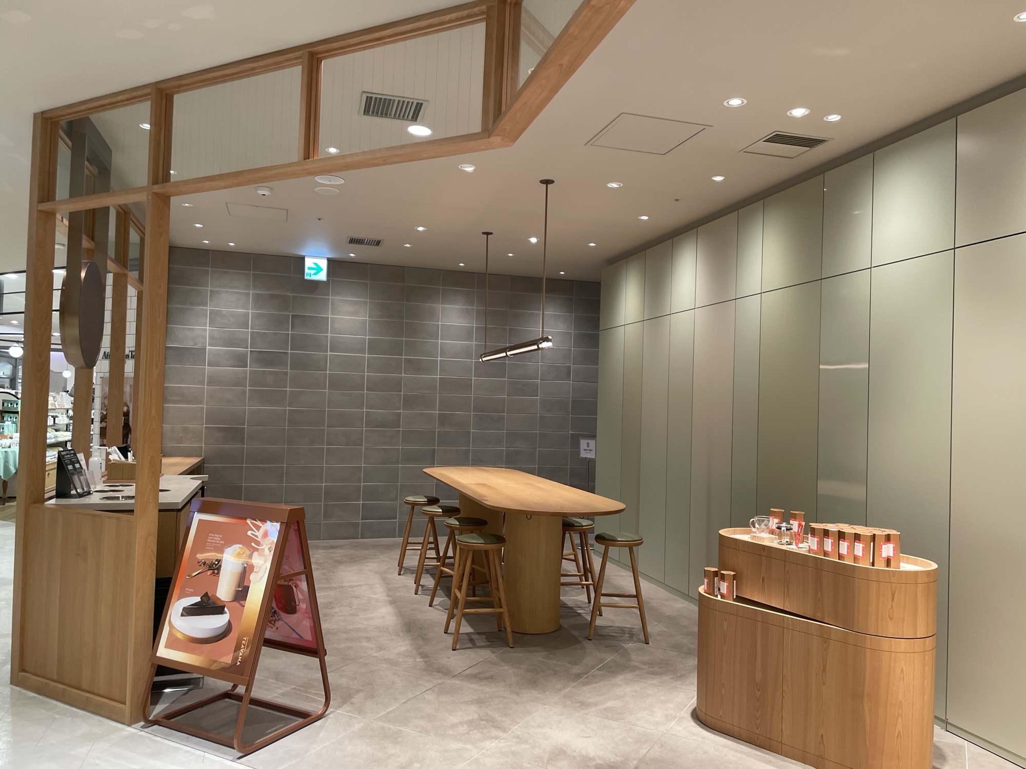 おなじみのグリーンのロゴではなく、明るい木目調とティーをイメージした優しい色彩が目を引くおしゃれカフェ風の店内。