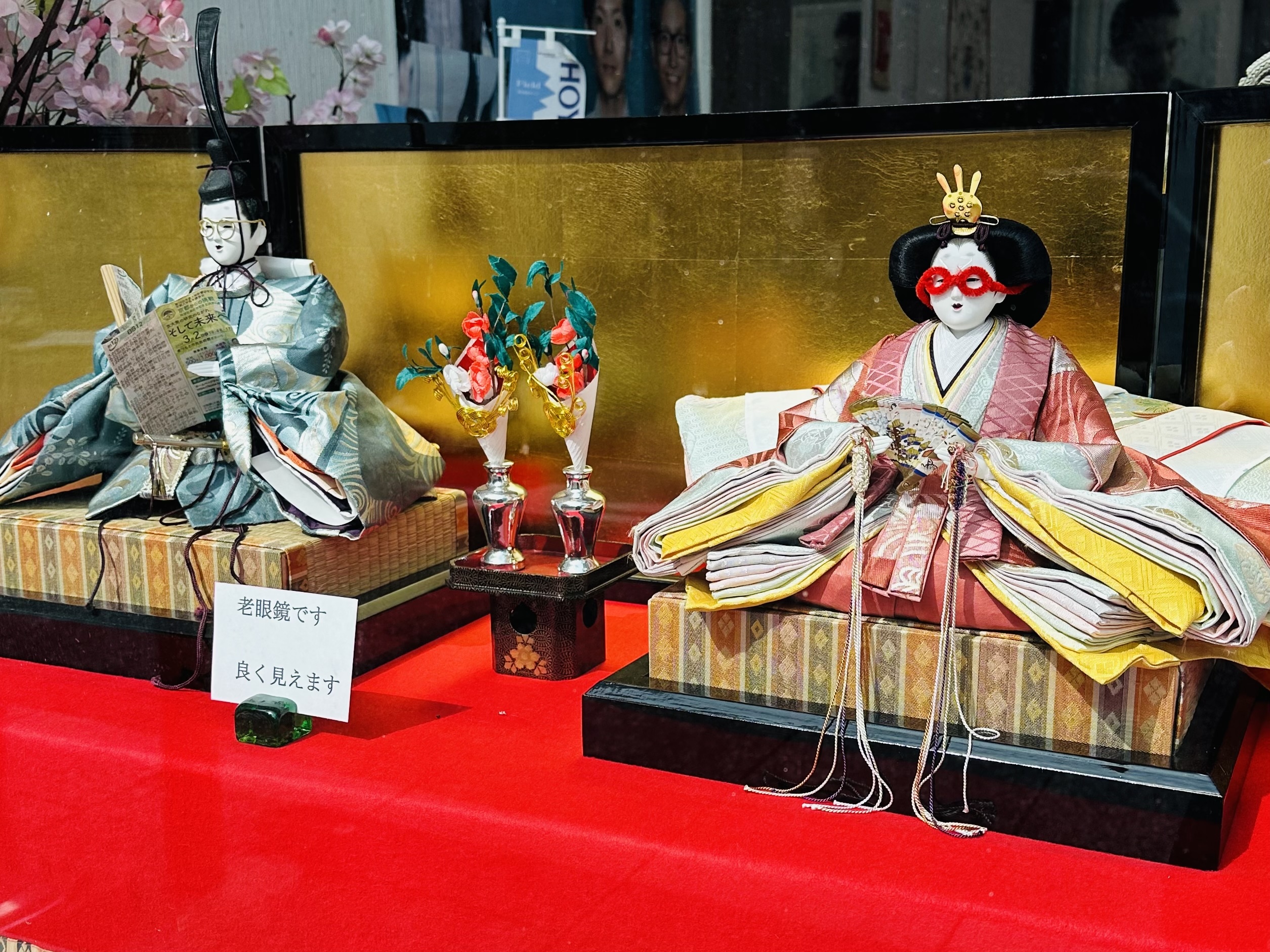 メガネ屋さんのメガネをかけた雛人形や、お肉屋さんではお肉を持った雛人形など、遊び心ある展示も見どころです。
