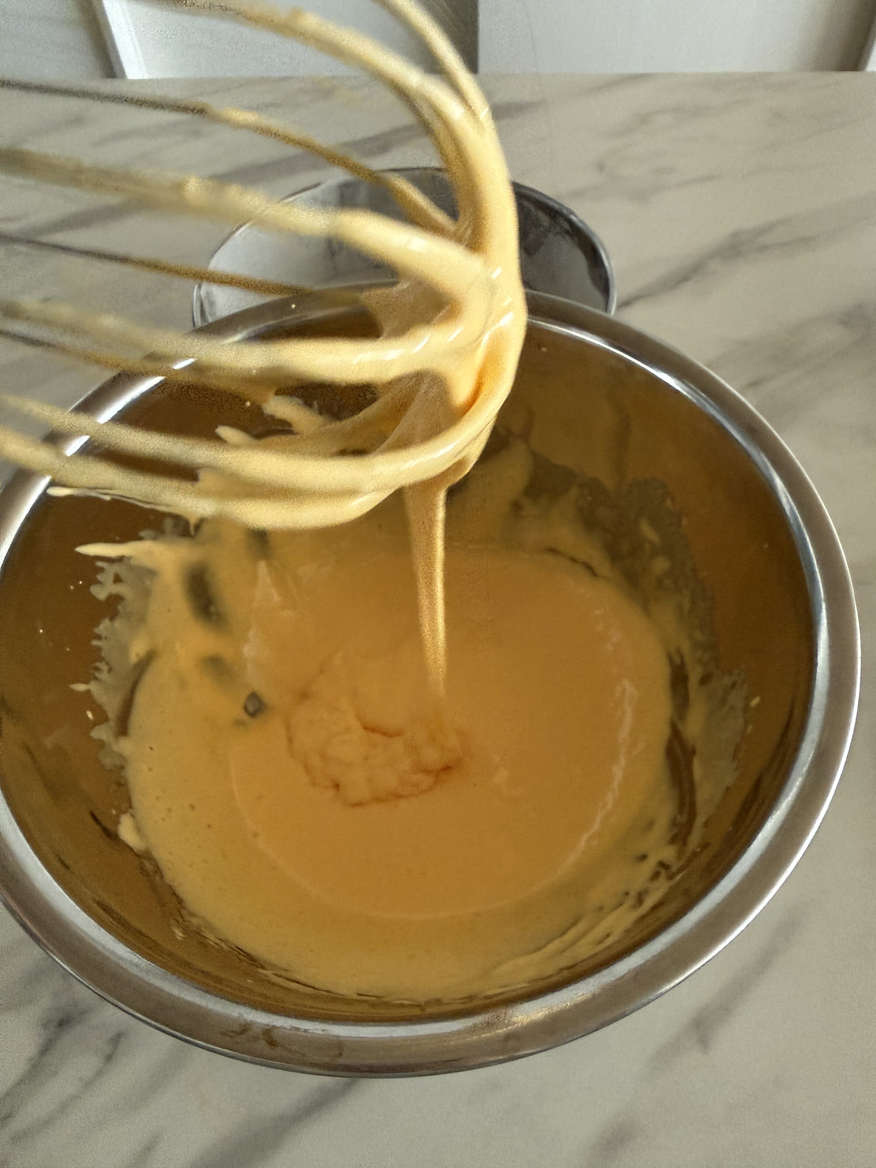 泡立てる前に、グラニュー糖と卵黄を人肌程度に温めてから泡立てます。