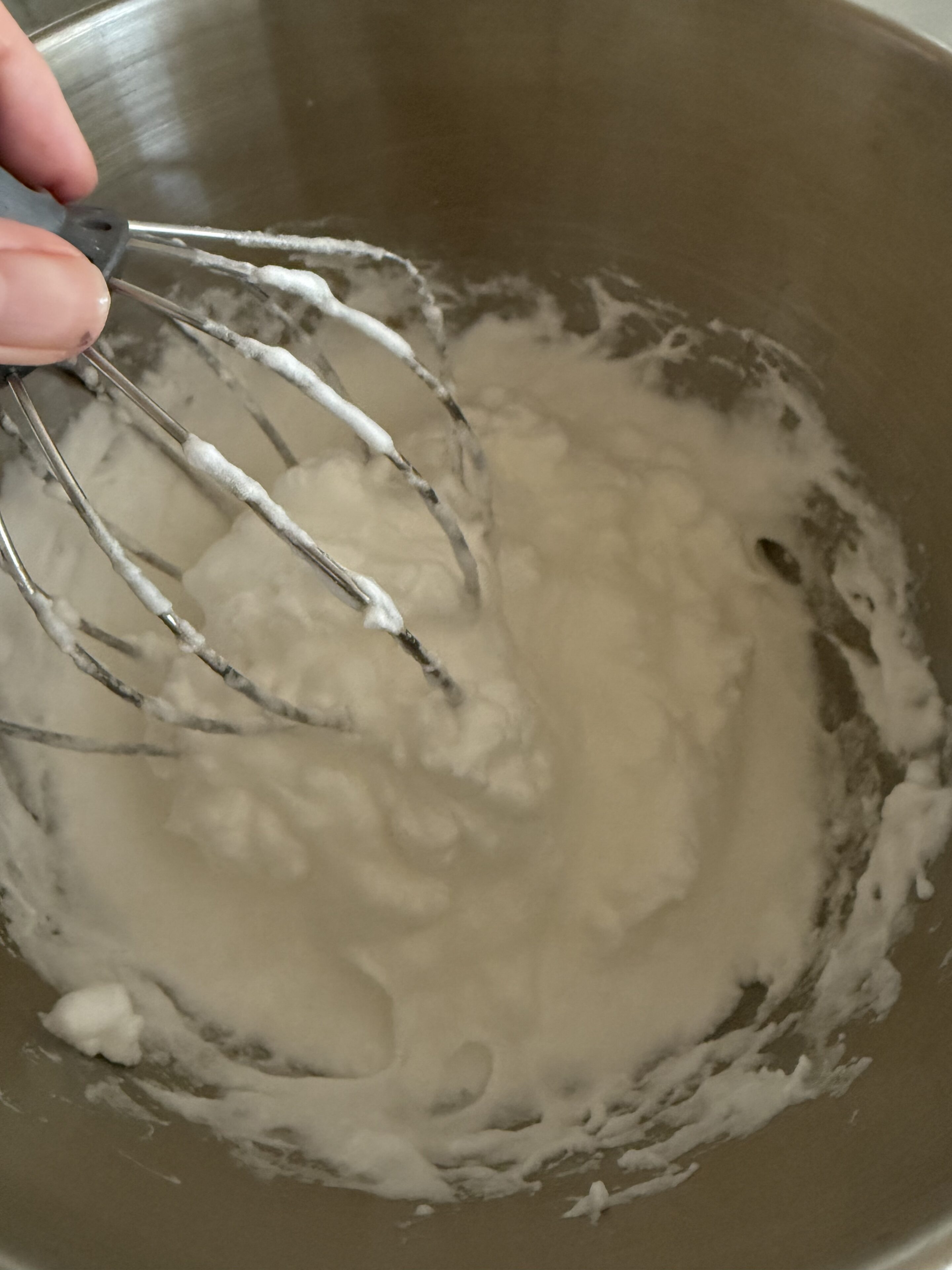 状態としては、ホイッパーで生地を持ち上げた時に落ちる生地がリボンのように落ち、少しあとが残ってから生地に馴染む状態がベストのサインです。