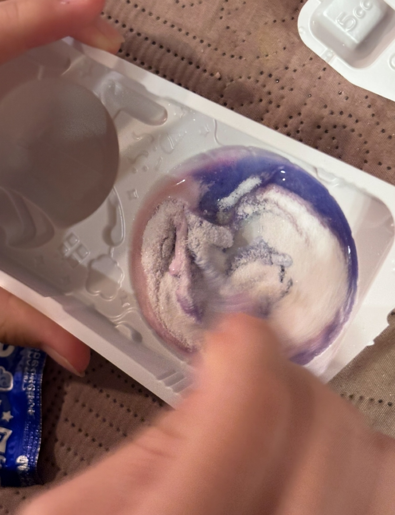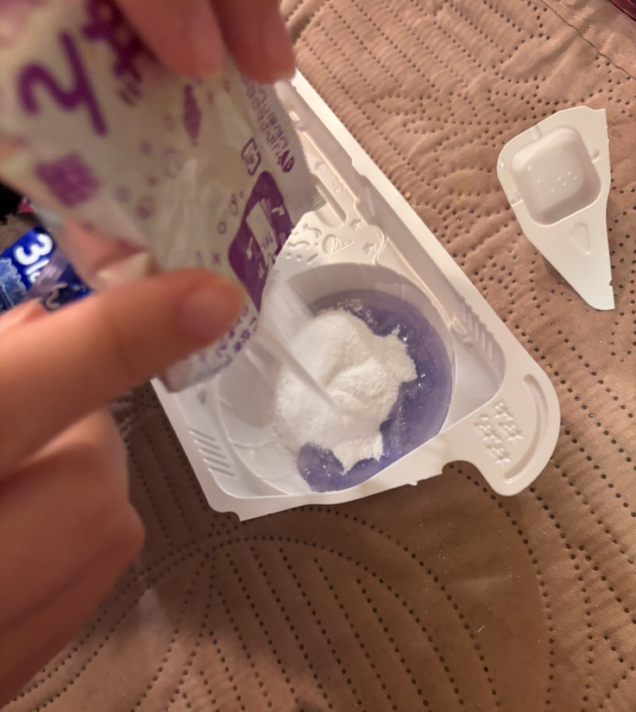 私達がやったのは、最初にトレーにお水を入れてそこに1番の粉を入れて、混ぜずにそのまま2番の粉も入れました。
