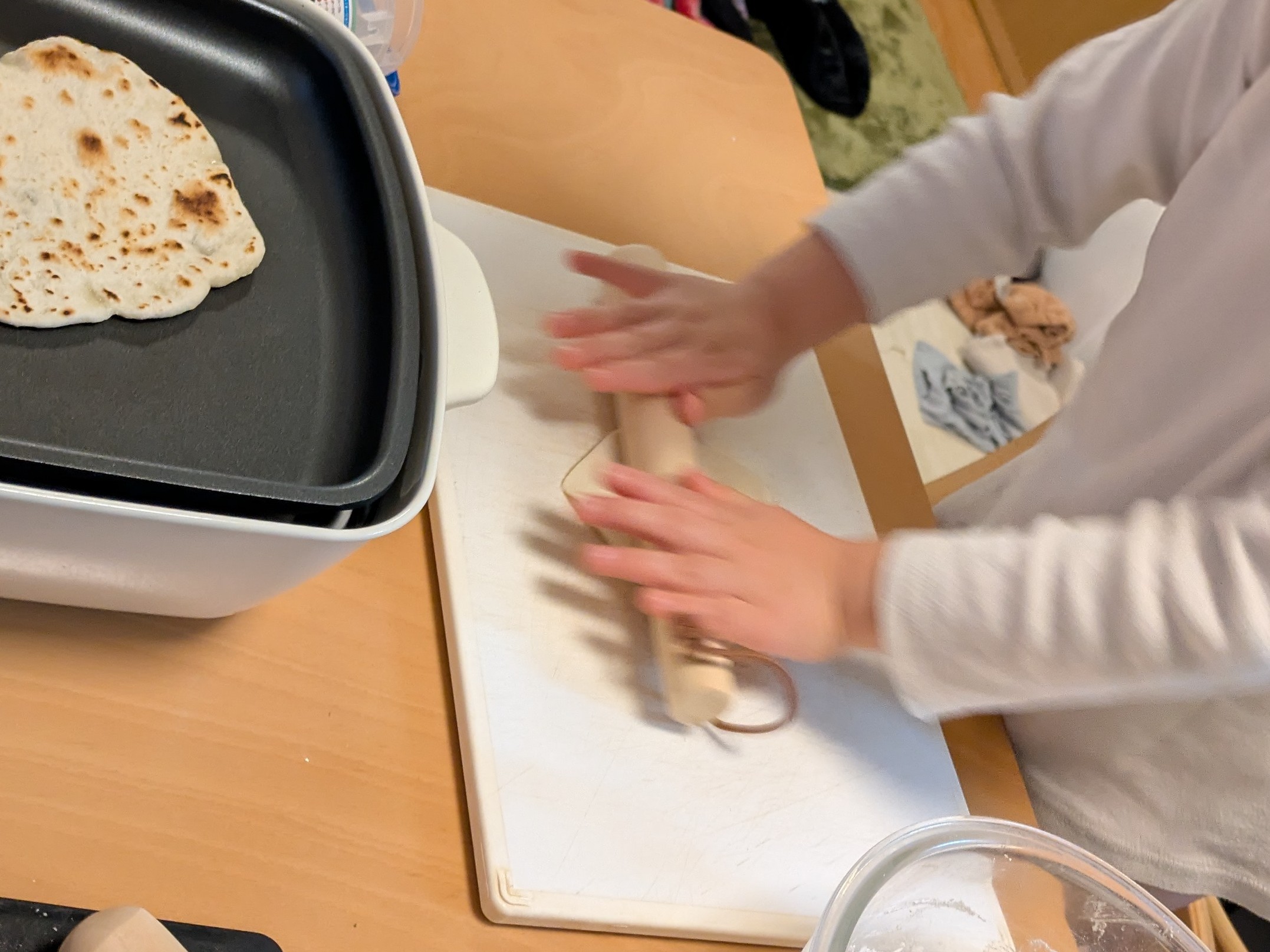 材料をすべて混ぜてこねて、30分ほど生地を休ませたら、生地を等分して丸め、伸ばして焼いていきます。手が汚れるのがいやな子は、ジップロックなどに材料を入れてこねるのもおすすめです。うちの子は、生地を触る感触が楽しかったようで、夢中になってこねこねしていました。