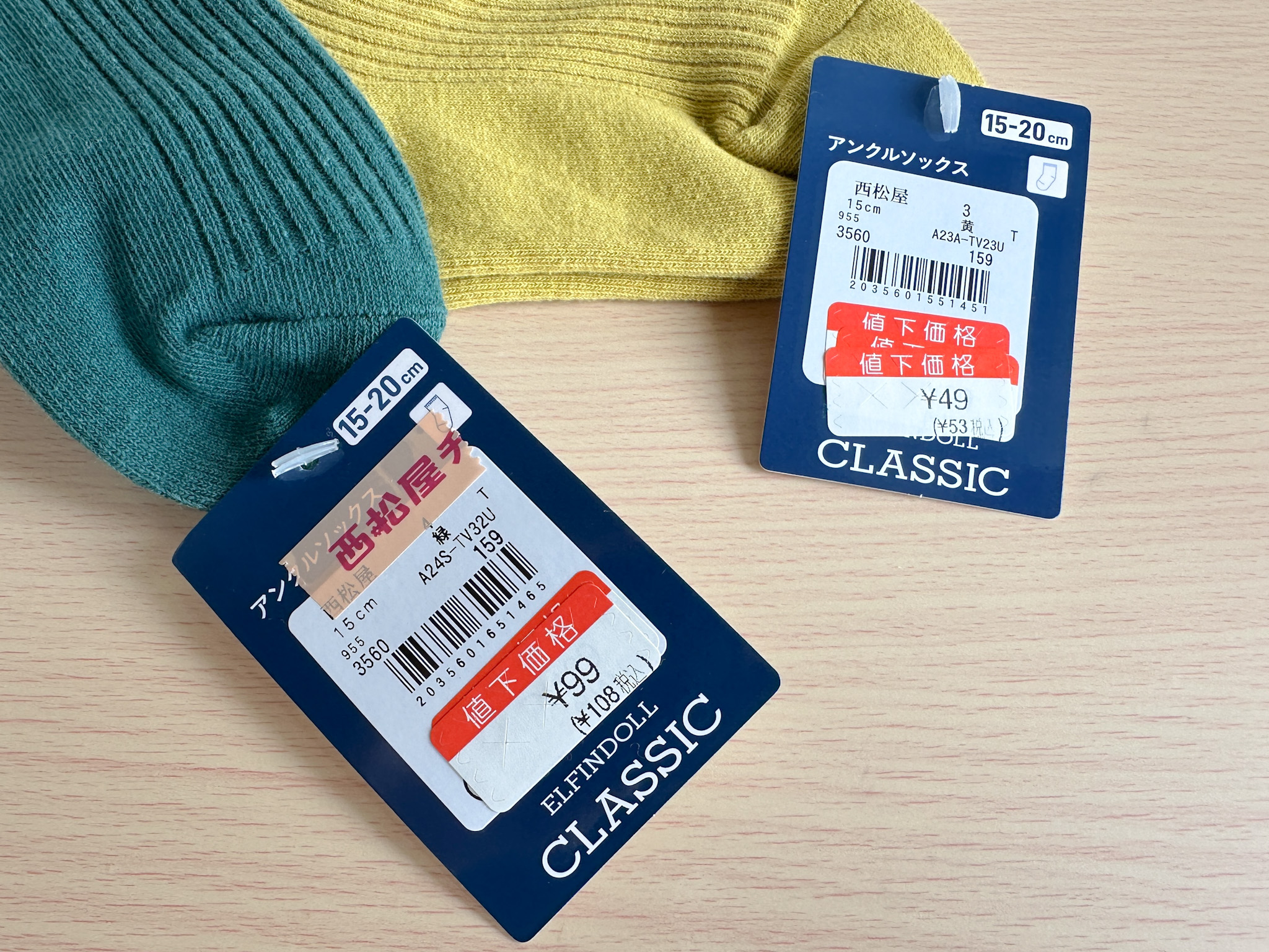 そして見つけたのがこちら。アンクルソックス。サイズは15〜20cm。なんと税込53円。元値159円からの値下げ。「これはもう買うしかない」とカゴに入れました。公園用にするには十分すぎるクオリティ。むしろ汚れても気にならない価格が本当にありがたいです。