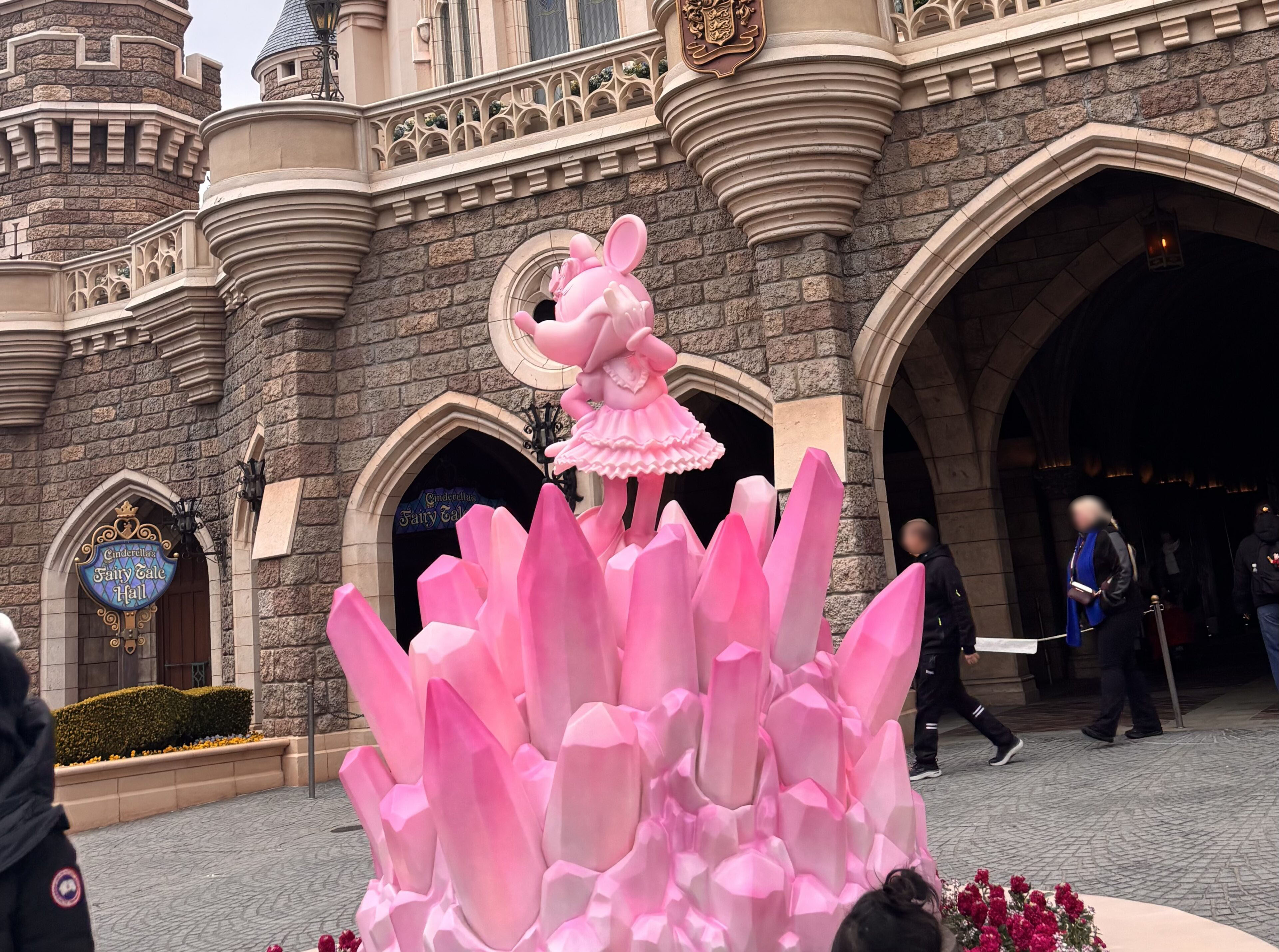 シンデレラ城の裏側には、ピンクのクリスタル風モニュメントがあります。ミニーちゃんらしいかわいいポージングを真似して撮影するのがおすすめです!