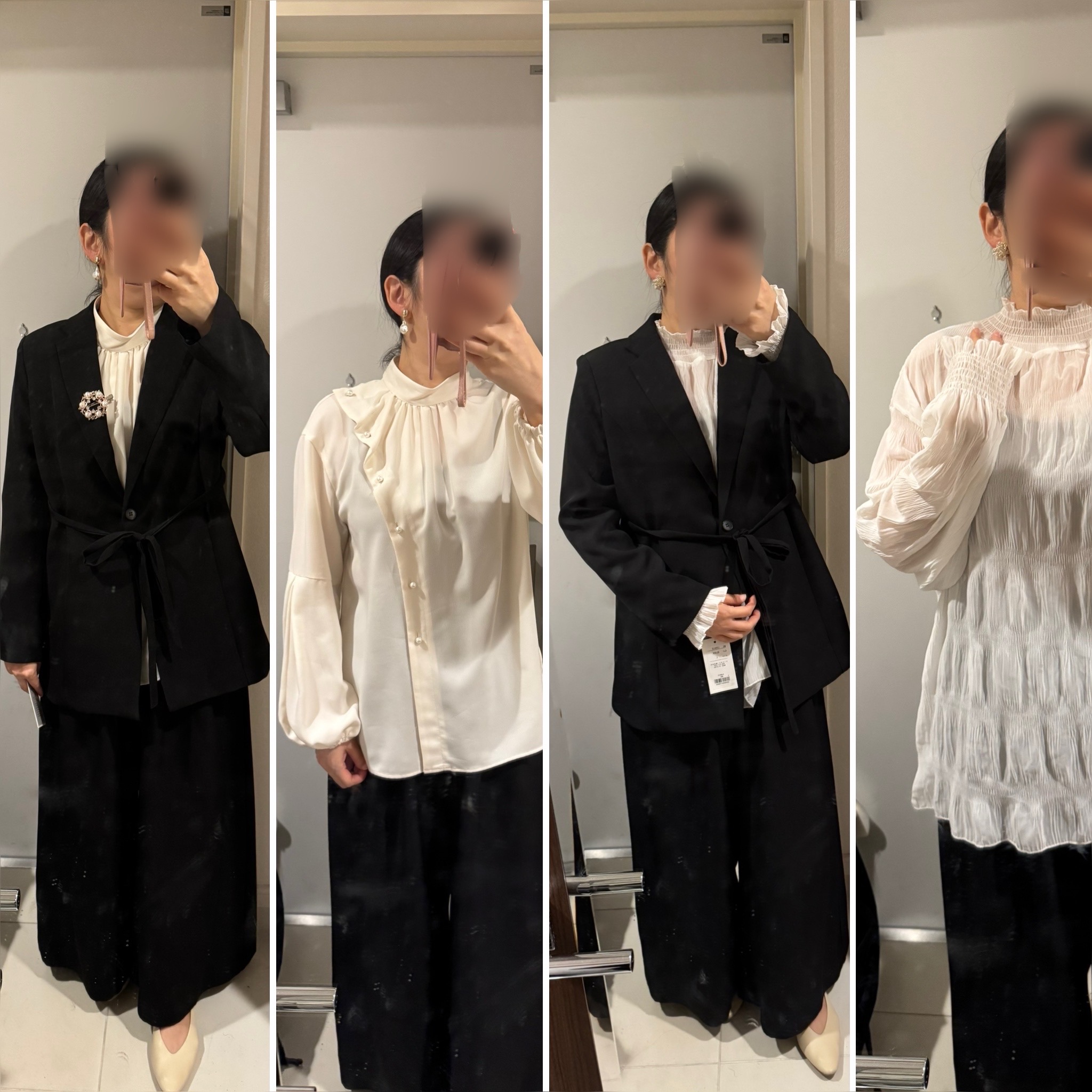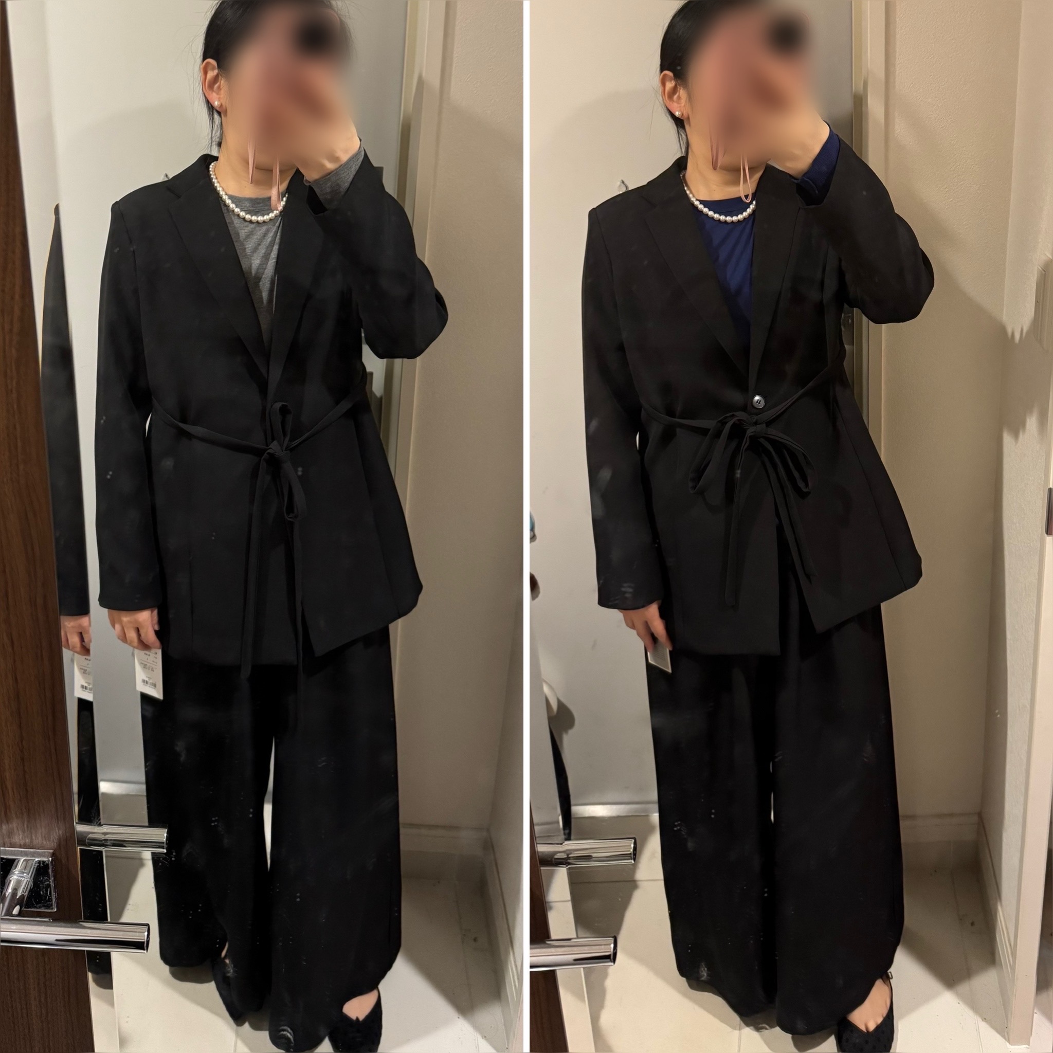 nianaのリボンジャケットパンツスーツ2点セット20,900円です。オンラインショップ(ZOZOTOWN)で購入しました。黒、グレー、ベージュの3色展開です。本当はグレーが良かったのですが似合わずに黒になりました。