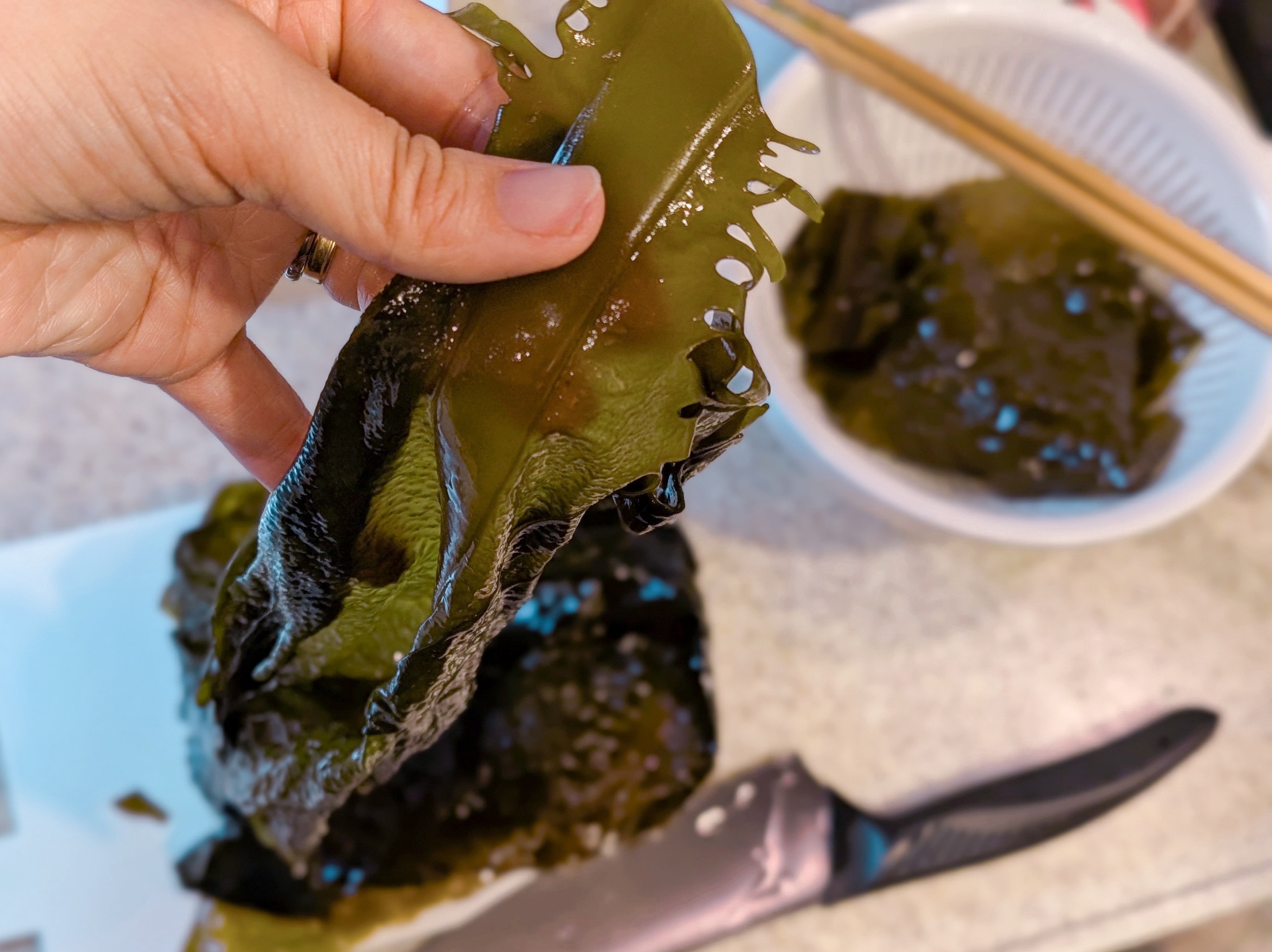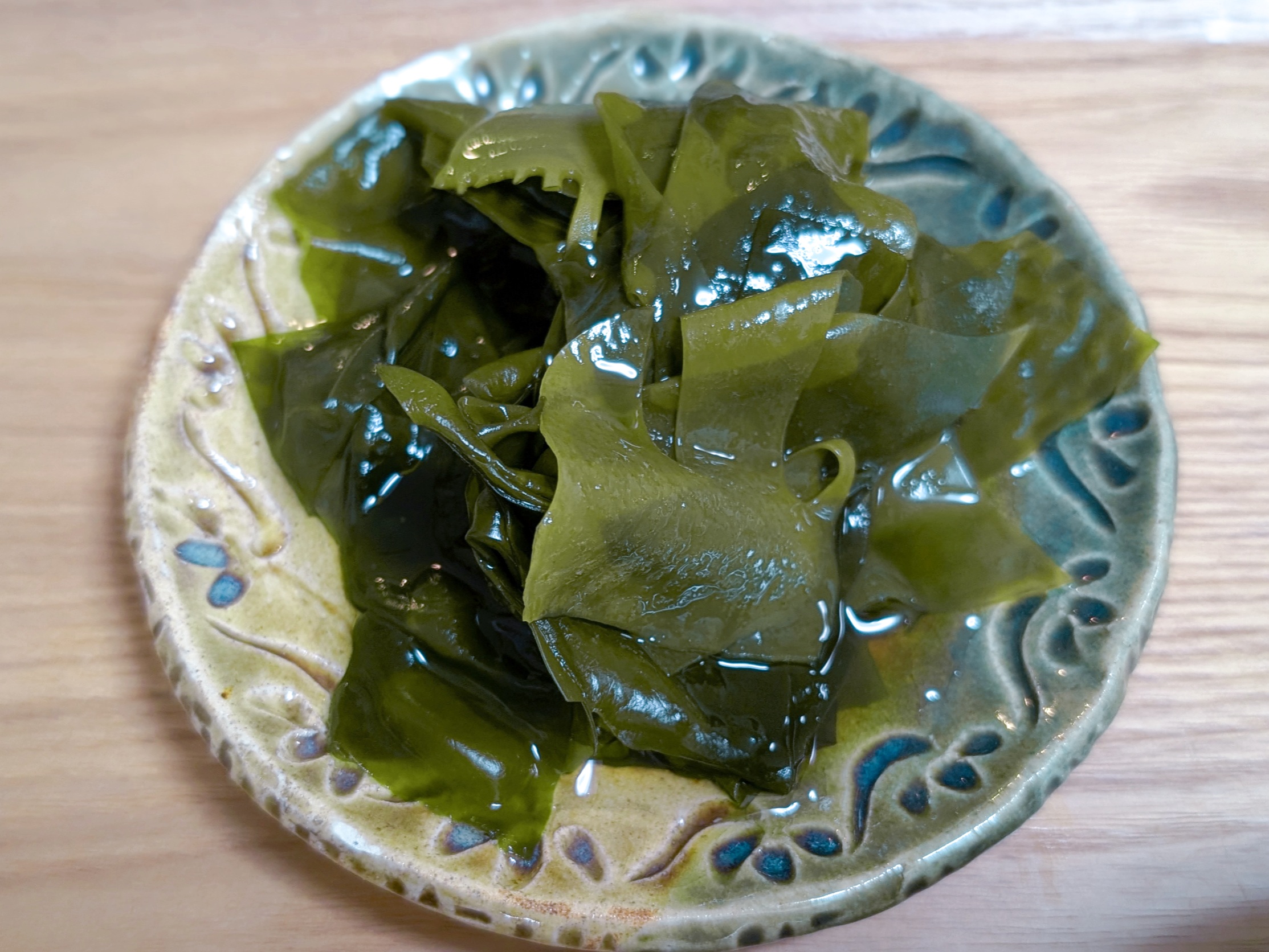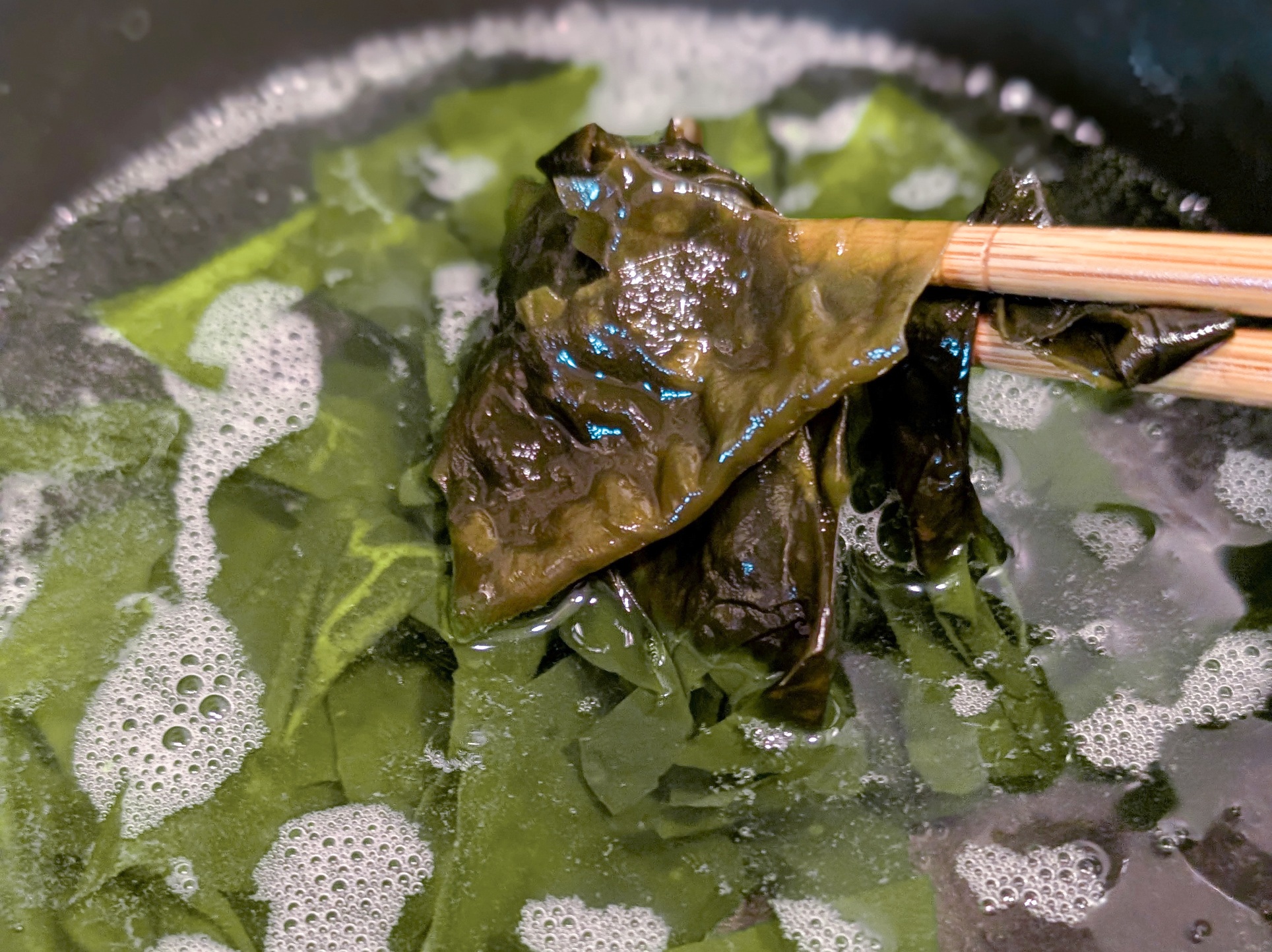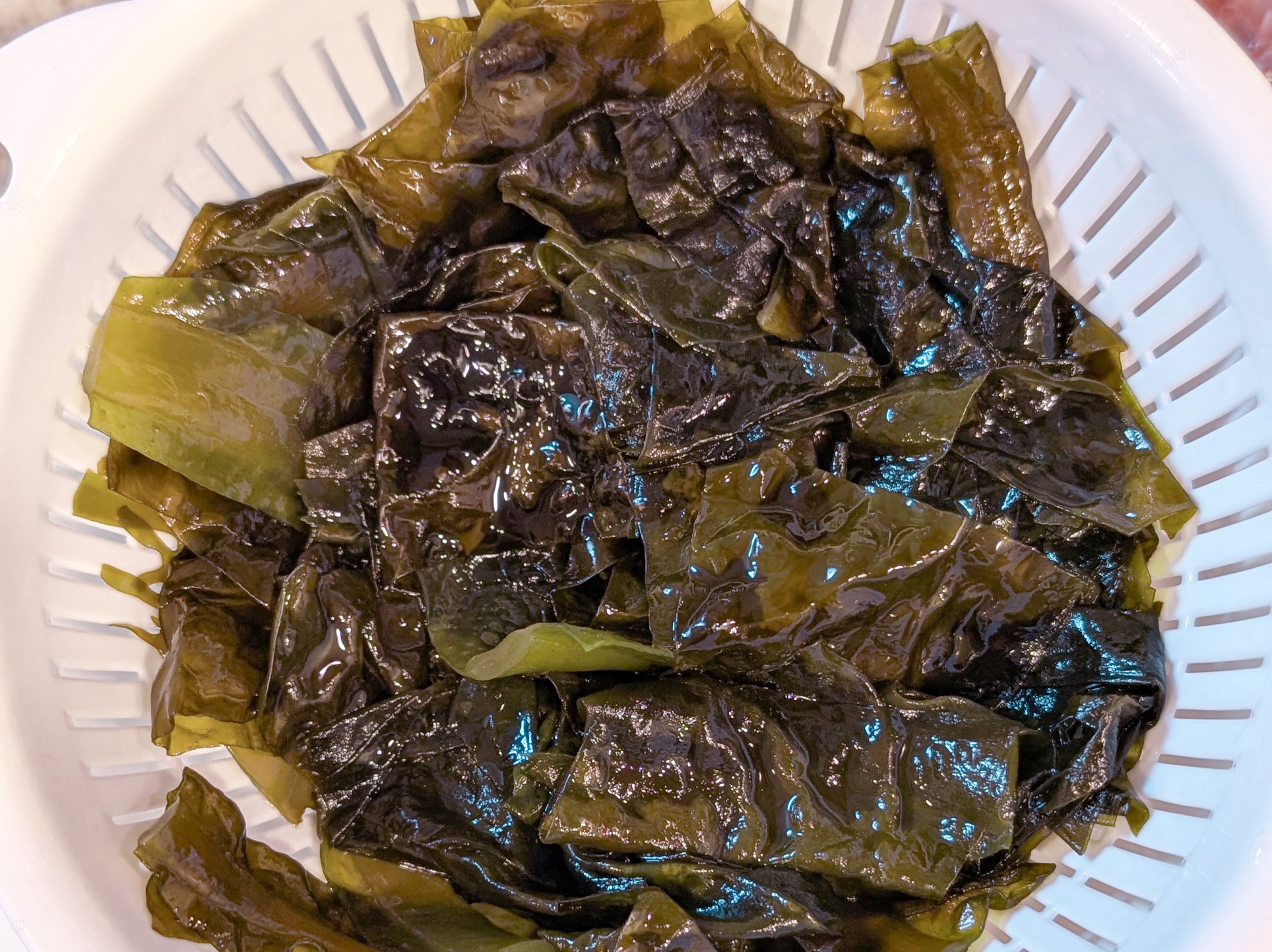 熱湯にくぐらせた瞬間、茶色だったわかめが鮮やかな緑色に変わります。そのあっという間の鮮やかな変化に家族全員で歓声を上げました笑。