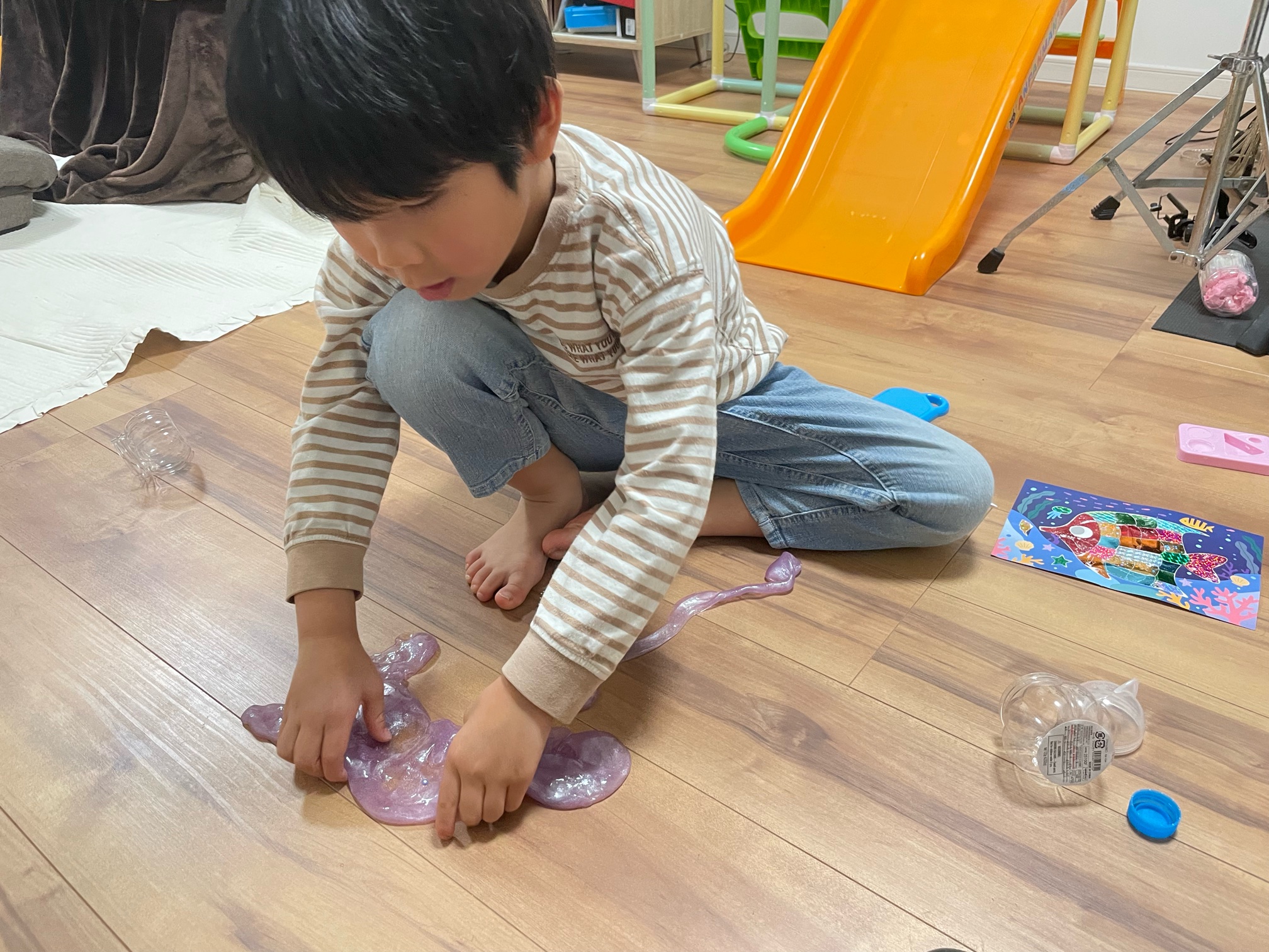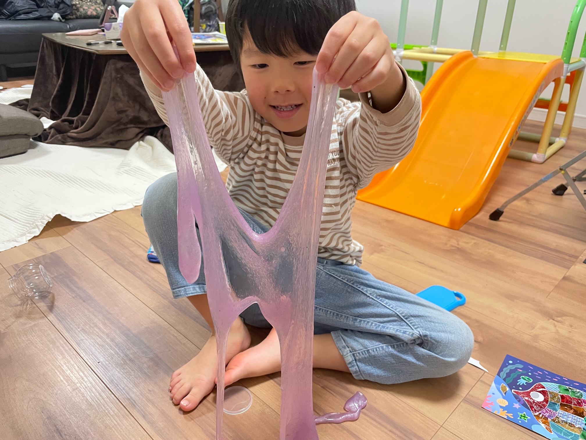 楽しいし、集中して色々と形づくりをしてくれている姿は嬉しい反面、毎回ドキドキするのが洋服やカーペットにベッタリとスライムをつけないかどうか。