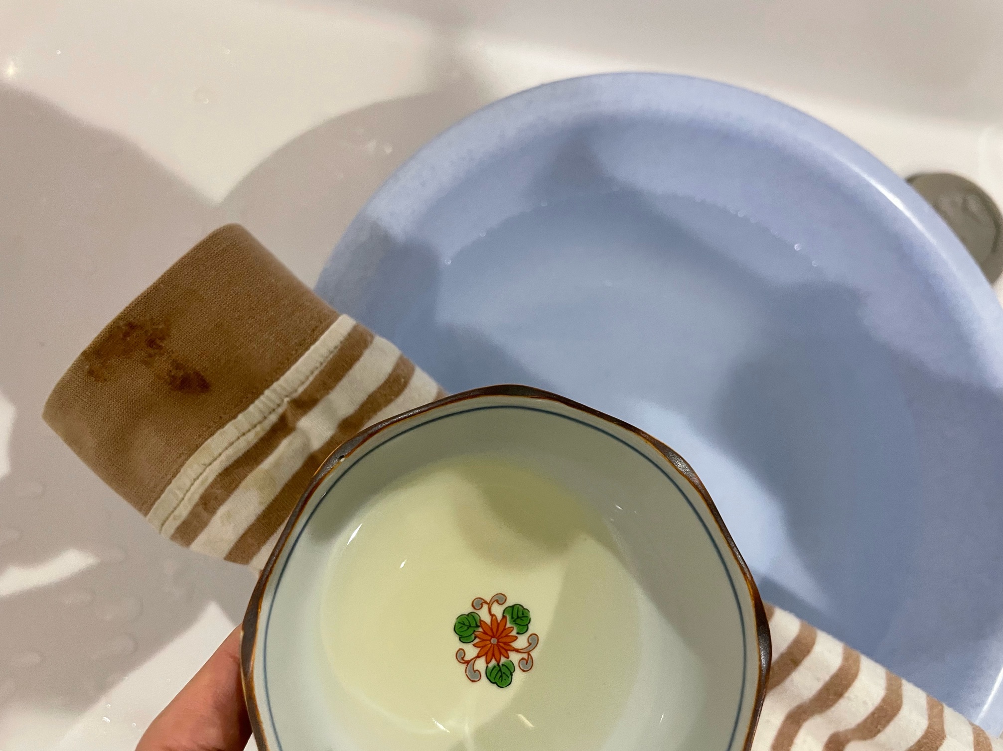 1、ぬるま湯を洗面器に入れて、お酢も混ぜる(洗面器8分目くらいに対してお酢は大さじ1くらい入れました)