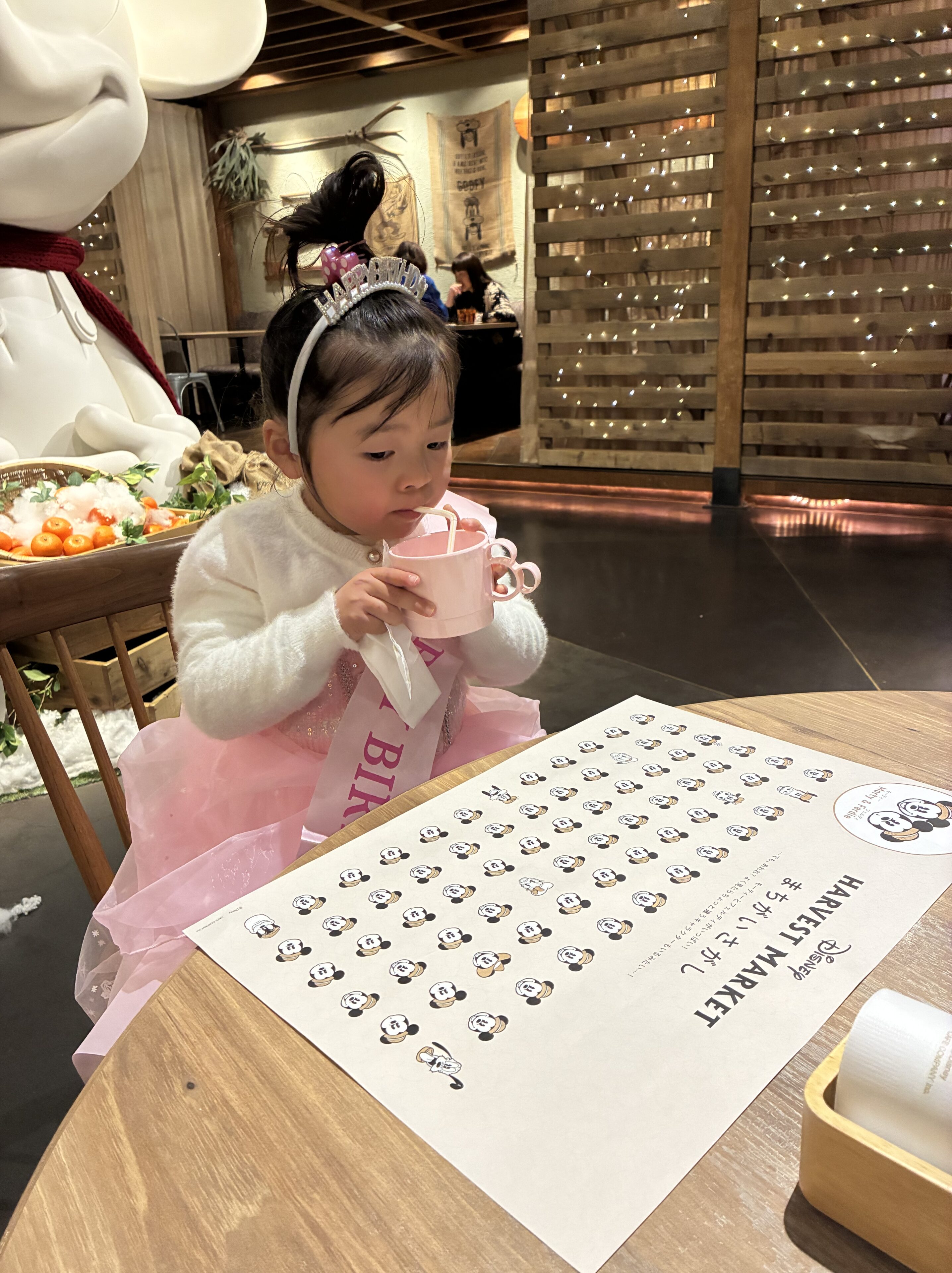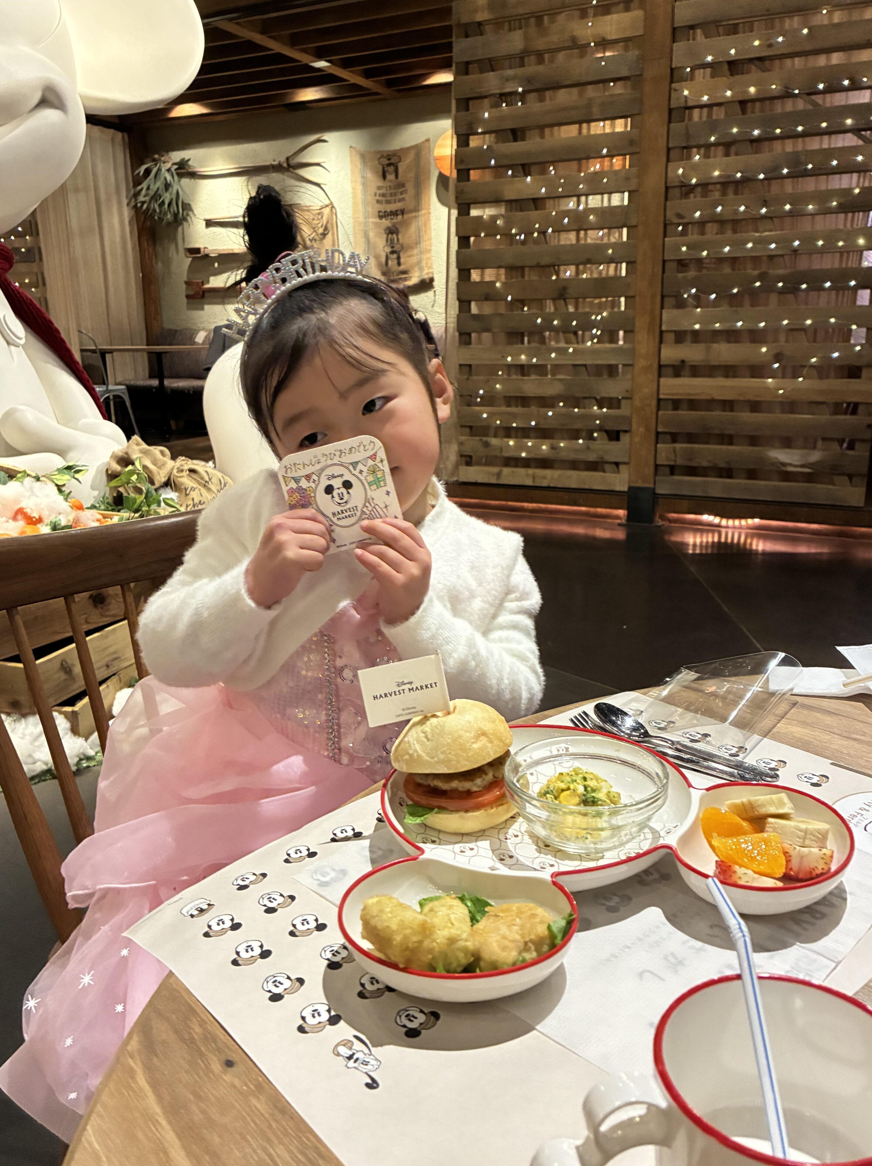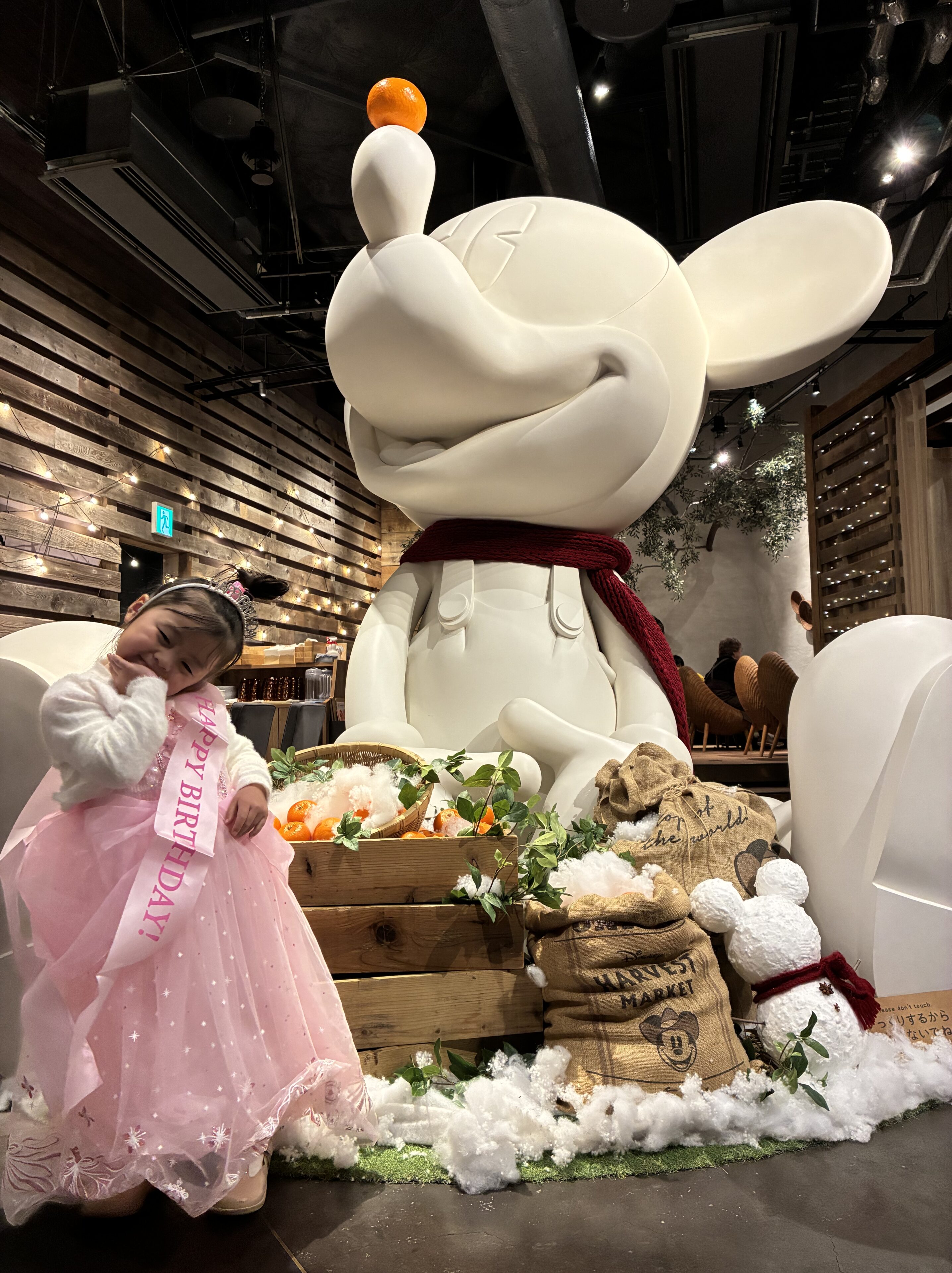 我が家は長女のお誕生日のタイミングで訪れたため、本人にミニーちゃんの個室がいいか大きなミッキーの前がいいか聞いたところ、大きなミッキーをチョイス!予約時にミッキーのスタチューの前がいいと伝えると目の前の席にしてくださいました。
