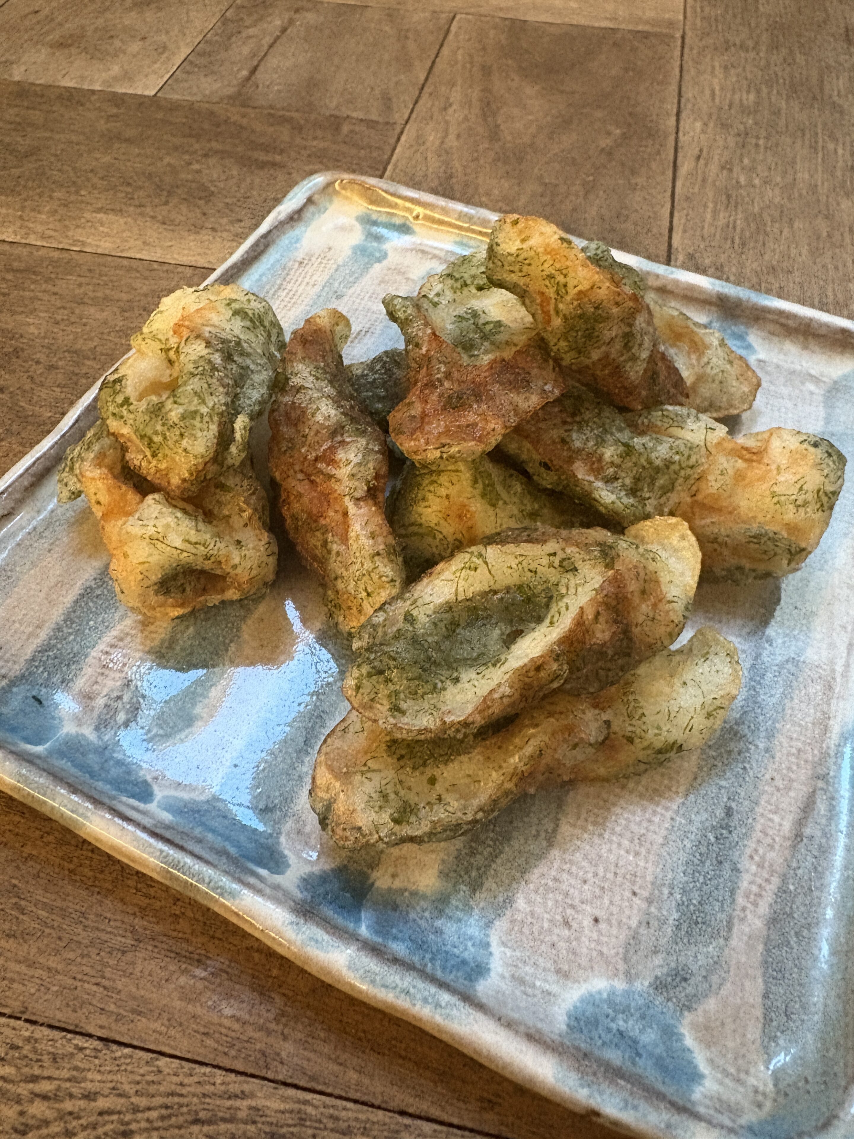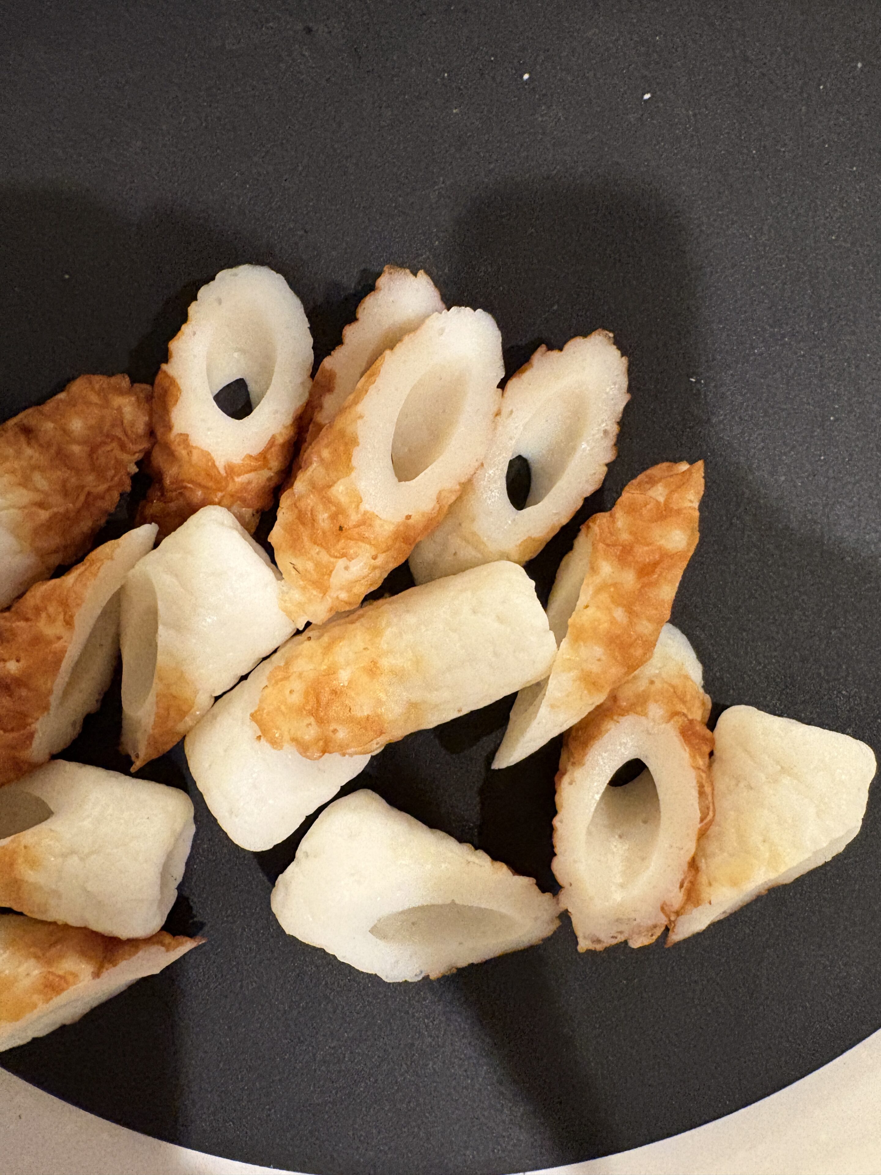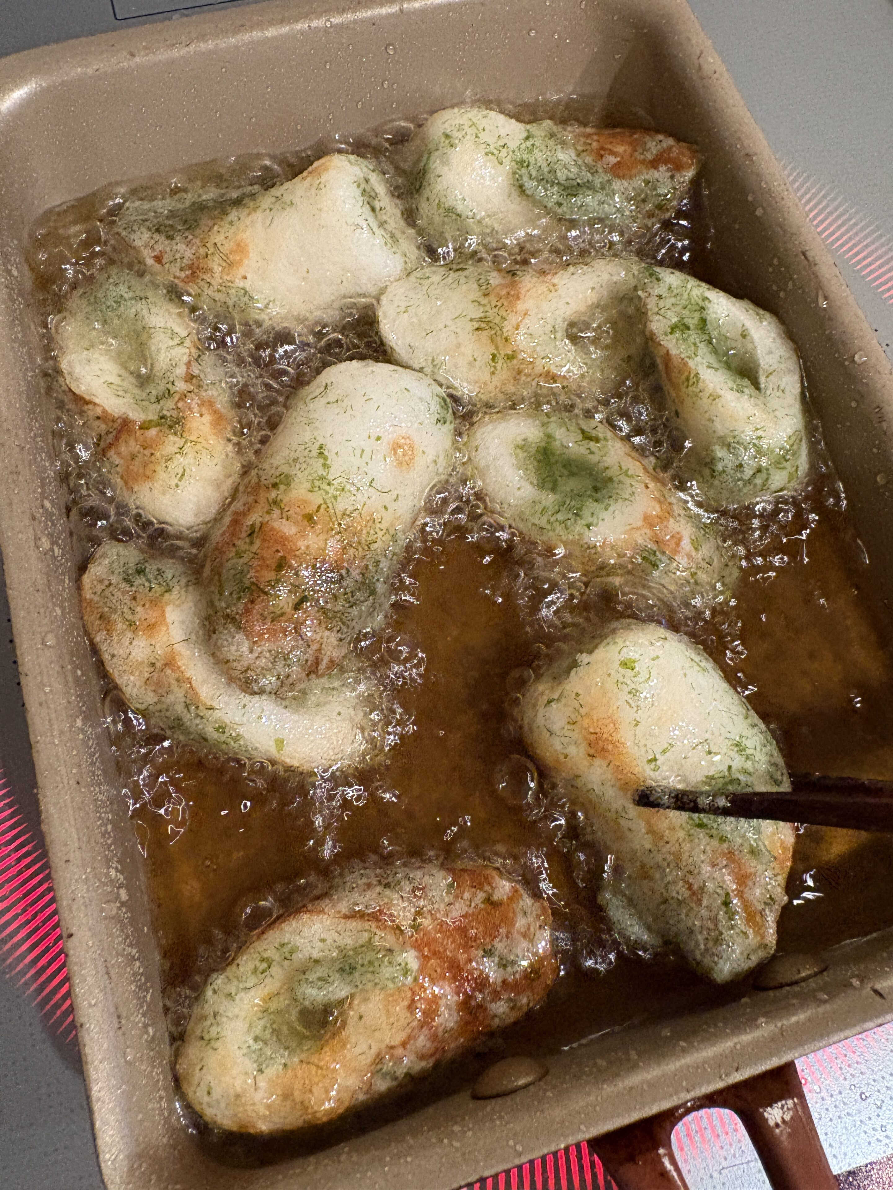 少ない油でも揚げれるように、ちくわを斜め切りにして、液と合わせて揚げて完成!