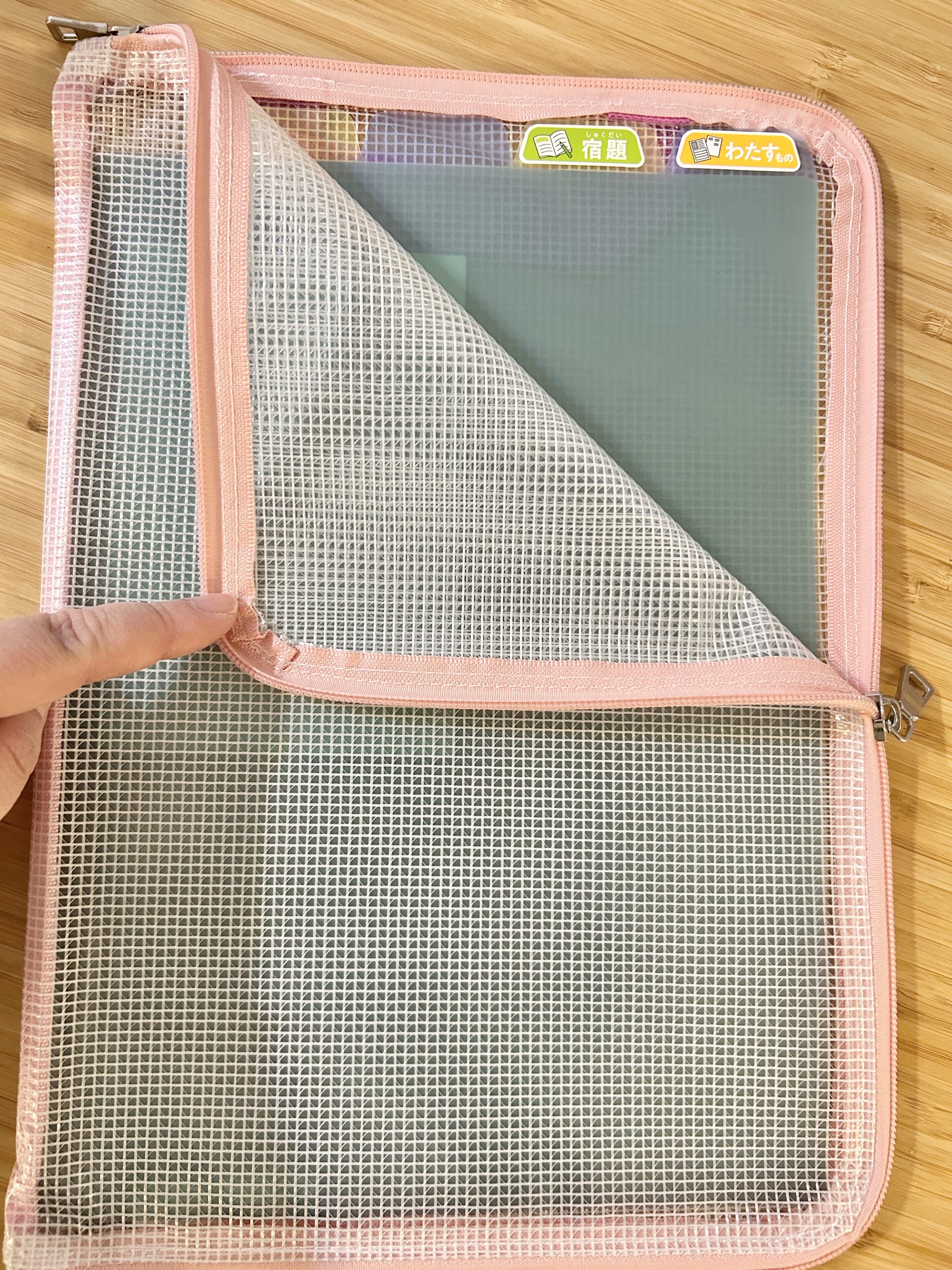 学校から配布されたプリント類を入れるファイルで、コの字に開くファスナーと少し固めのタブ付き仕切り4シートでプリントをきれいに保管できます。しわ防止にも◎。