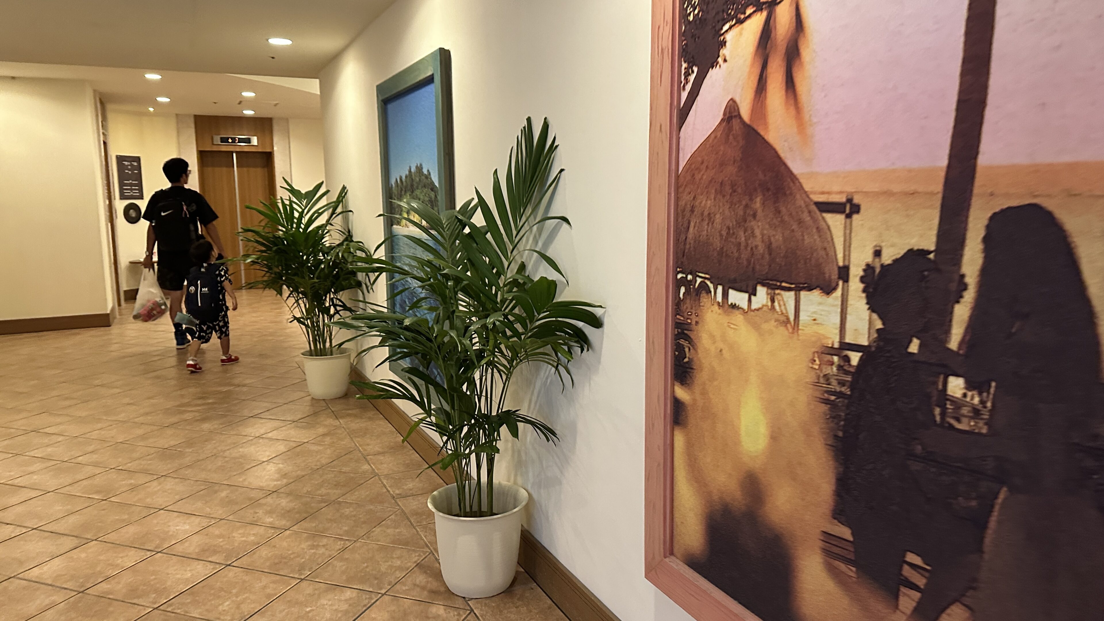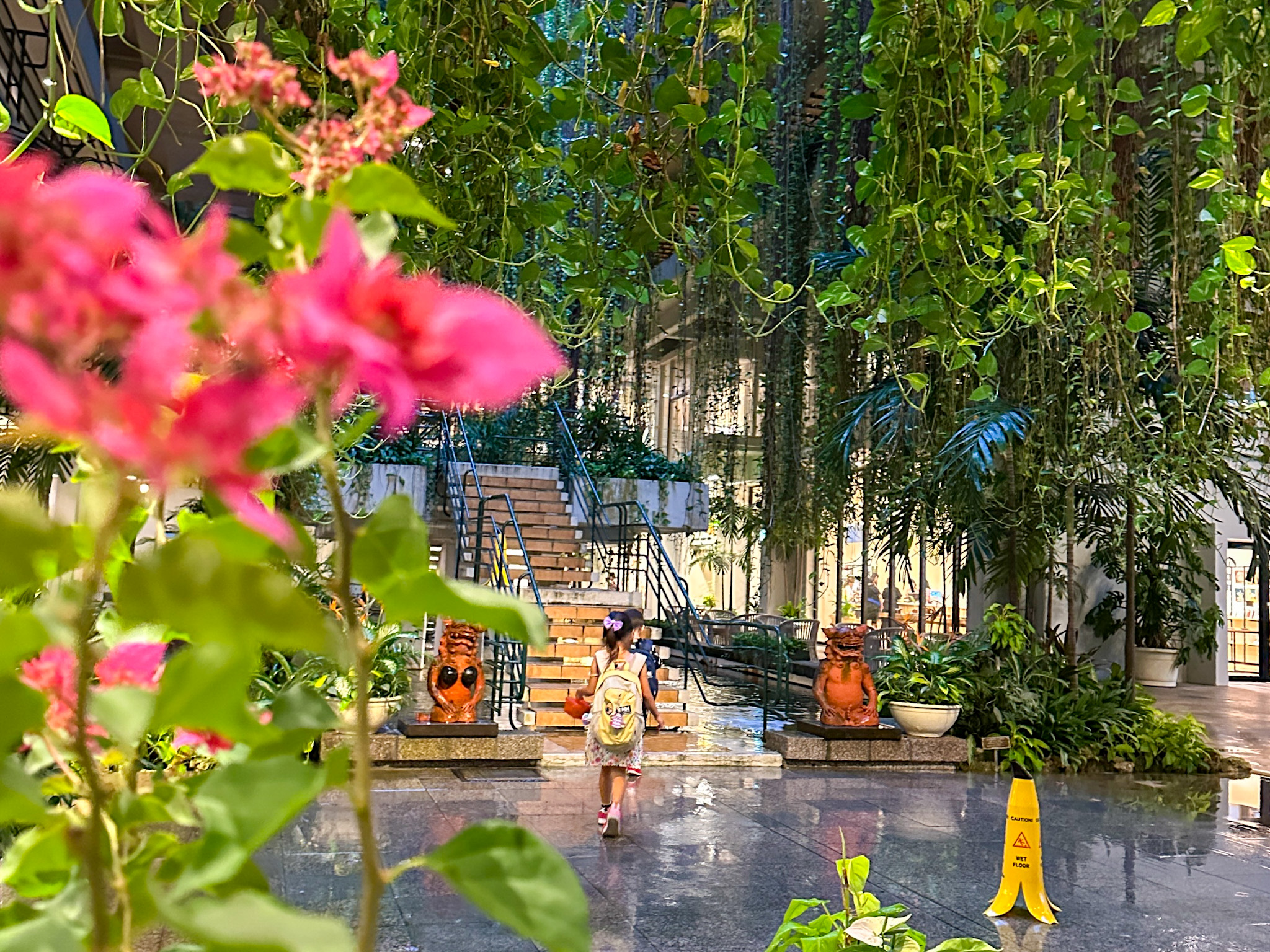 最近はカードキーが主流ですが、ここは昔ながらの鍵タイプ。このレトロさがたまらなくてきゅんとしました。子どもたちも「こんなに大きな鍵、初めて見た!」と大興奮。建物自体も1975年創業の歴史あるリゾートで、重みがあります。吹き抜けのアトリウムロビー、木のぬくもり、どこか懐かしい南国感。双子も私もホテルに入った瞬間、一瞬でテンションアップ。派手すぎず落ち着いているのも魅力的で、「ずっと愛されてきた理由があるホテル」という印象でした。