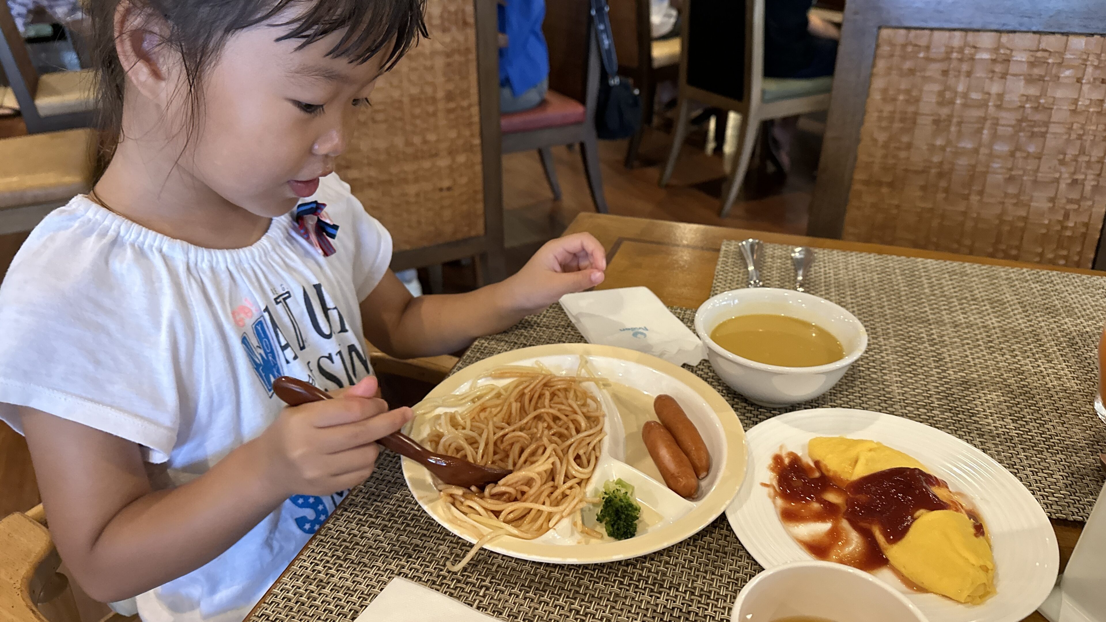 開放的な朝食会場。目の前にはビーチ。青空ではなかったけれど、海を感じる空間で食べる朝ごはんは格別でした。沖縄料理も充実。定番メニューもどれも美味しくて、胃袋が足りないと思えるほど。子どもが食べやすいラインナップもあり、家族全員が満足できる朝食でした。