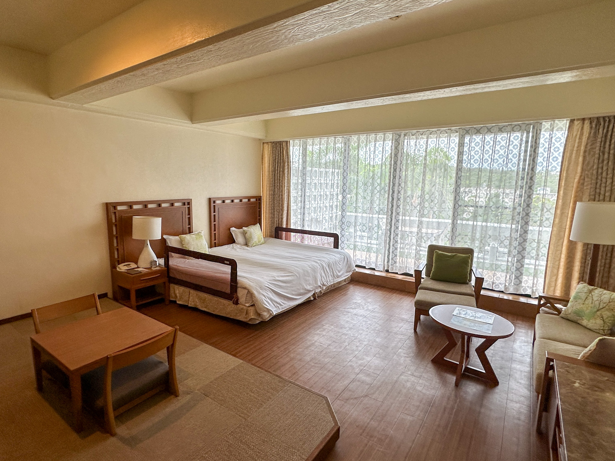 今回結婚式へのご招待だったこともあり、広めのお部屋にアップグレードしていただきました。そのおかげで、雨でもお部屋の中で買ってきたお土産や沖縄のお菓子を食べて室内パーティーすることができました。「これ美味しいからもう1つ買って帰ろう」「この飲み物、後でまた買いに行こうね」など、沖縄の味を堪能することもできました。お部屋の中だと親も双子もくつろげますし、座敷とベッドが分かれていたことで汚す心配もなく快適に過ごすことができました。個人的にはこの自由でゆったりとした時間が、今回の雨旅行の時間を豊かにしてくれたように思います。